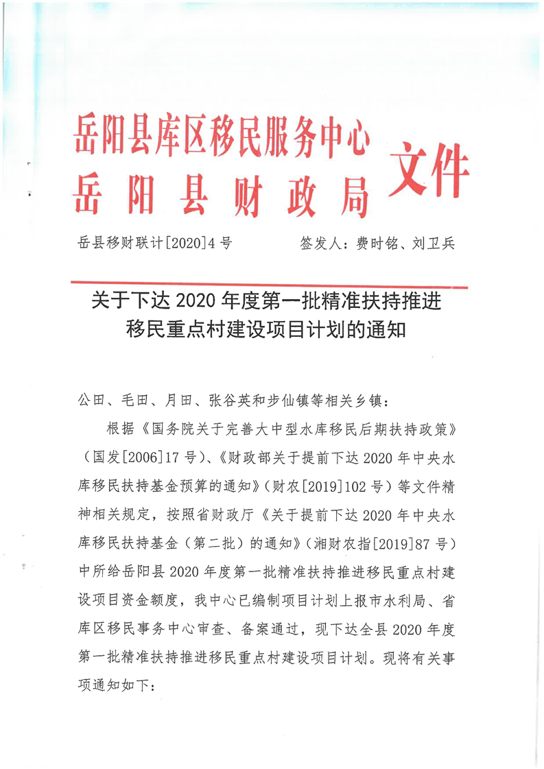 關於下達2020年度第一批精準扶持推進移民重點村建設項目計劃的通知