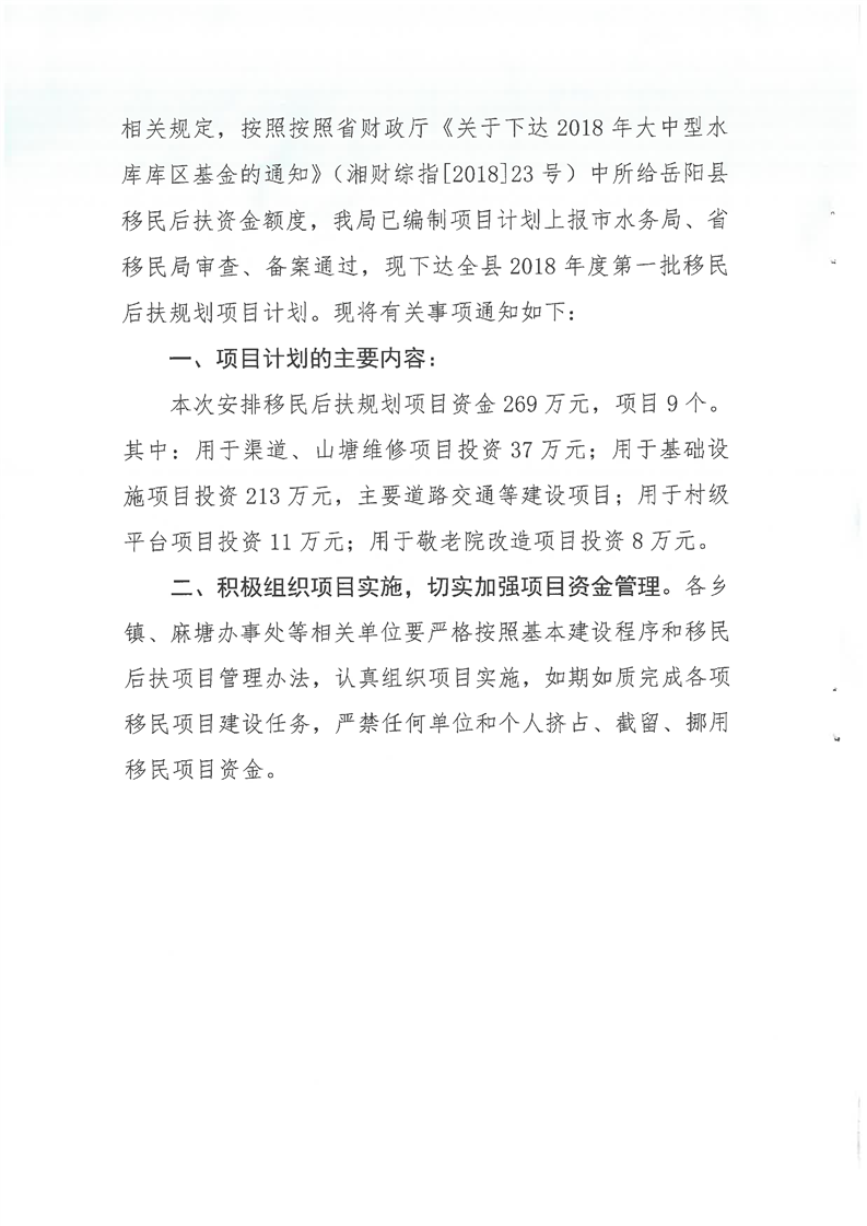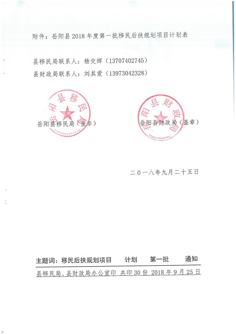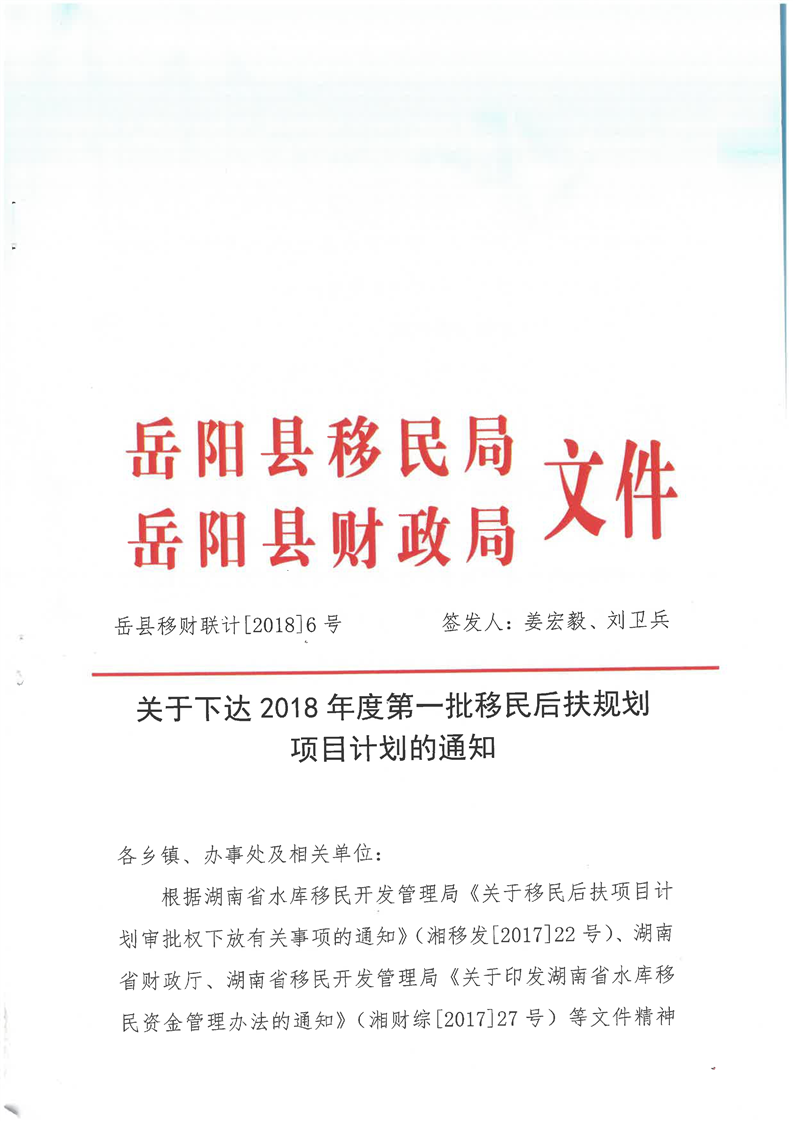 嶽縣移計[2018]6號文計劃下達的通知