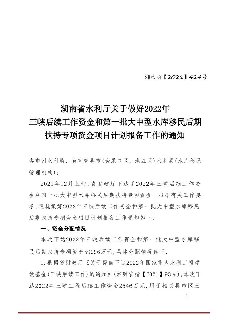 湖南省水利廳關於做好2022年三峽後續工作資金和第一批大中型水庫移民後期扶持專項資金項目計劃報備工作的通知