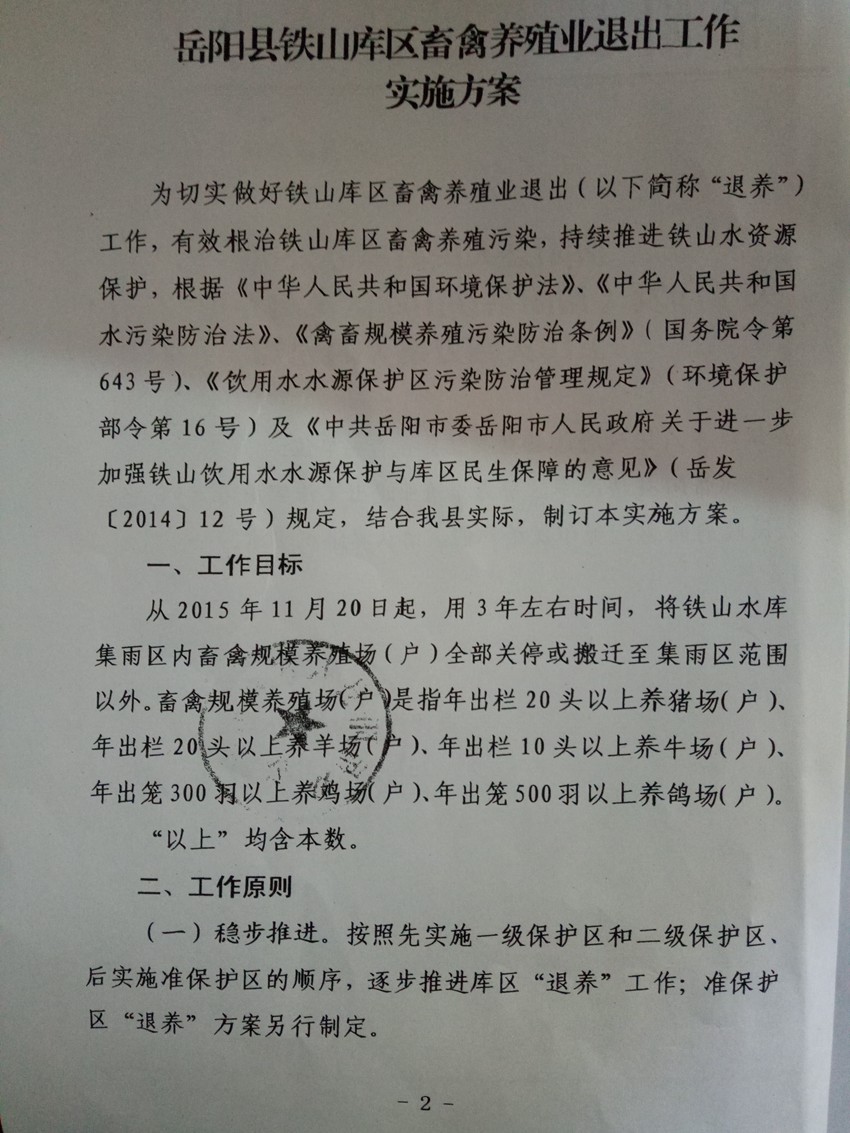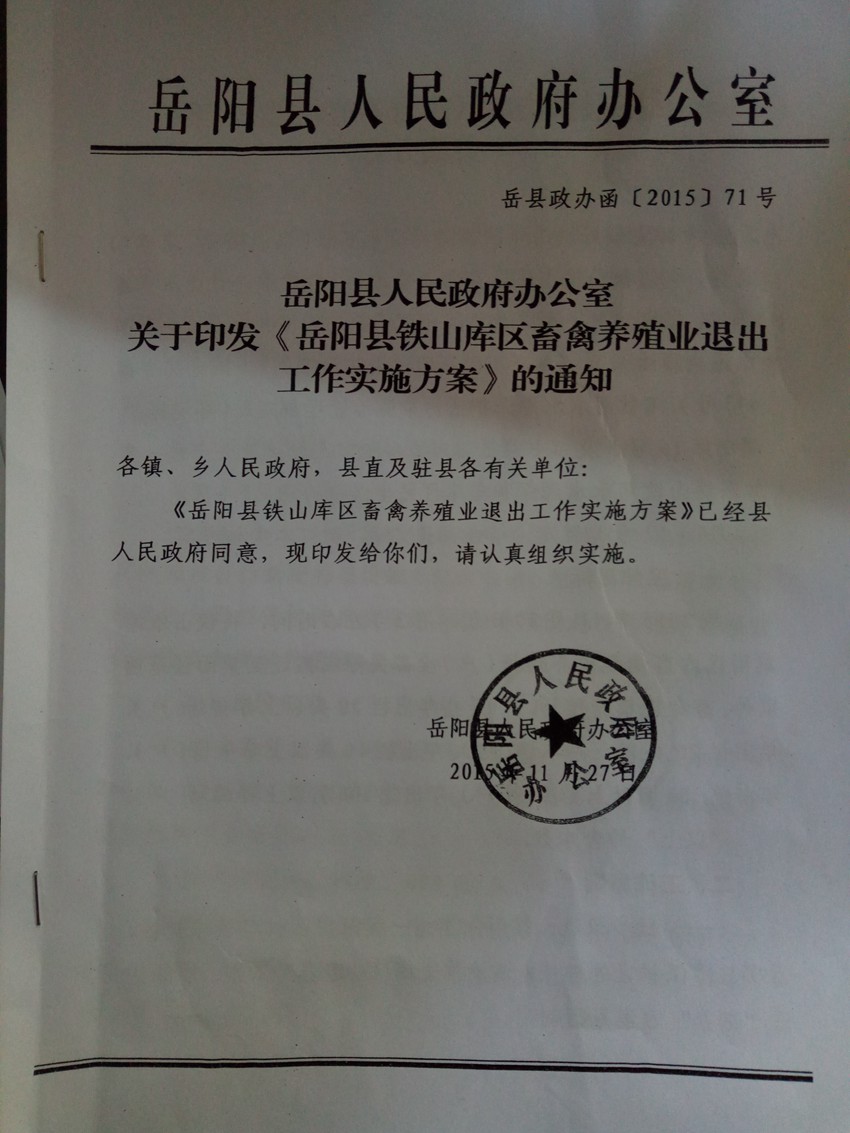 嶽陽縣人民政府辦公室關於印發《嶽陽縣鐵山庫區畜禽養殖業退出工作實施方案》的通知