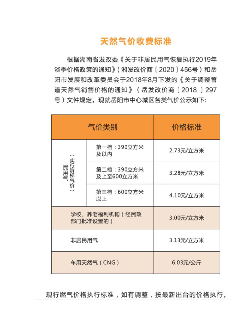 天然氣氣費收費價格標準