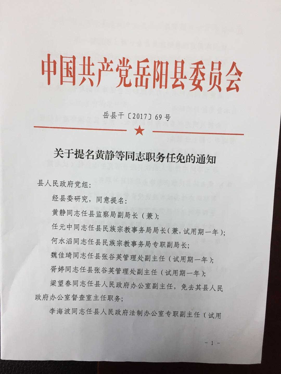 關於提名黃靜等同誌職務任免的通知