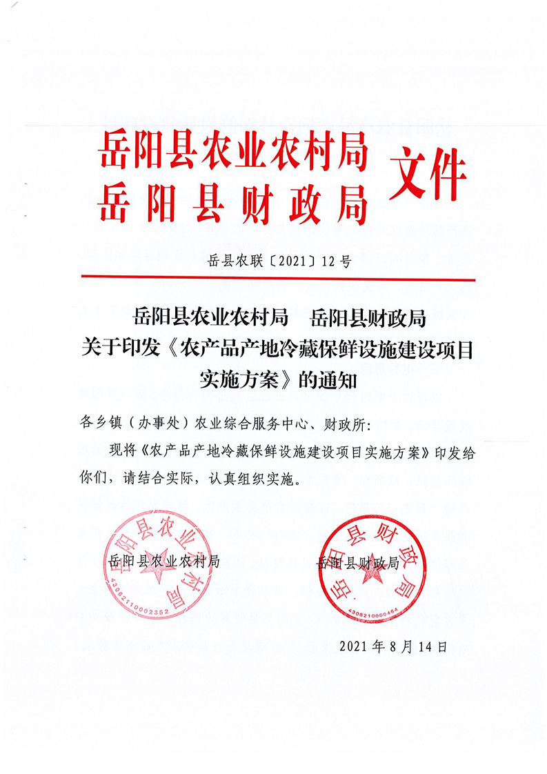 關於印發《農產品產地冷藏保鮮設施建設項目實施方案》的通知