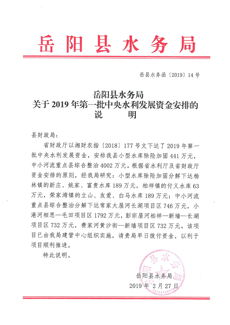 2019年中央水利發展資金安排說明