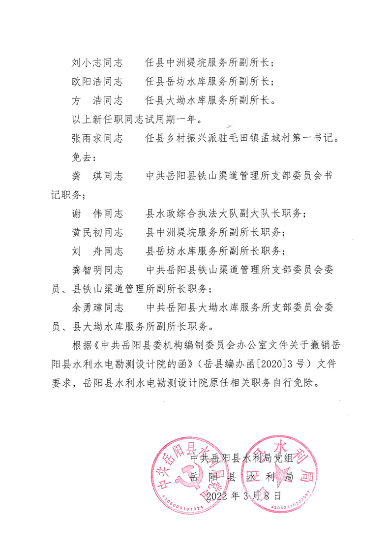 嶽陽縣水利局關於黃能文等同誌職務任免的通知