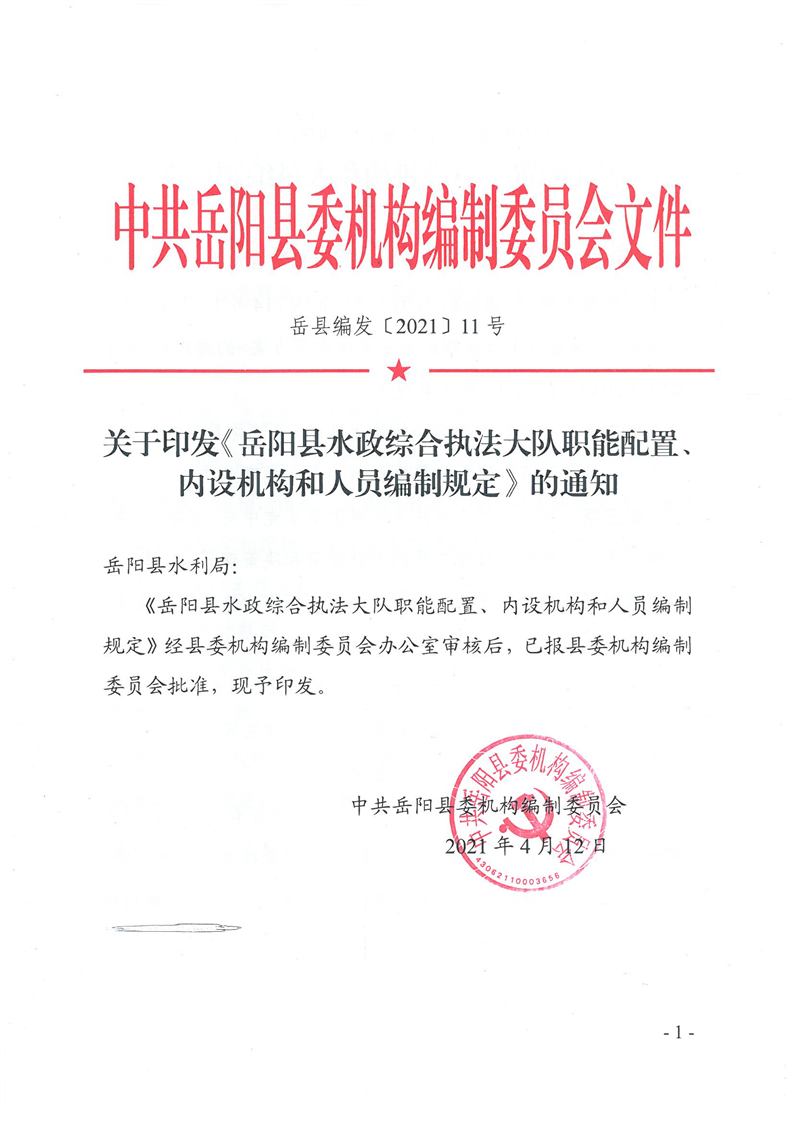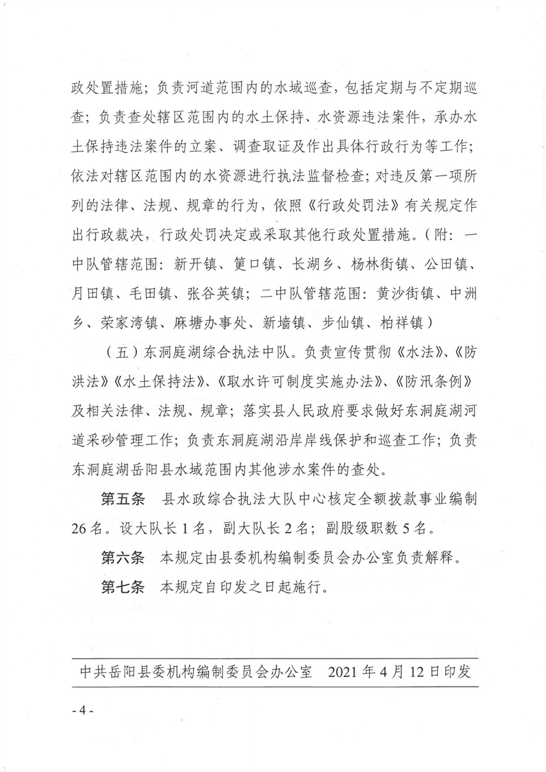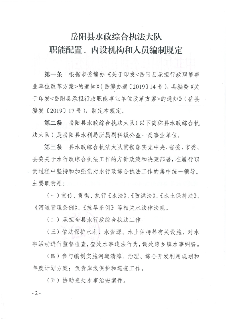 嶽陽縣水政綜合執法大隊職能配置、內設機構和人員編製規定