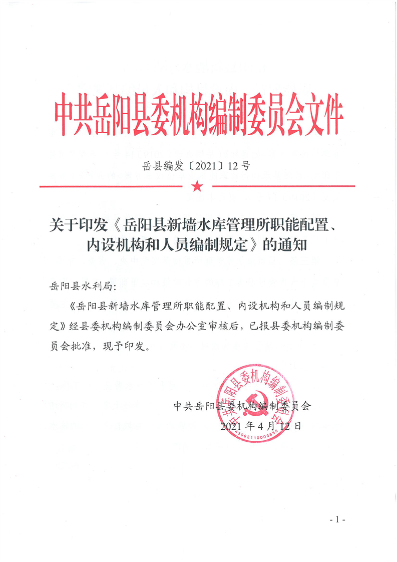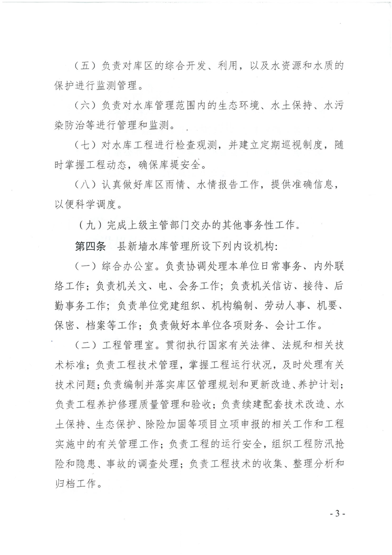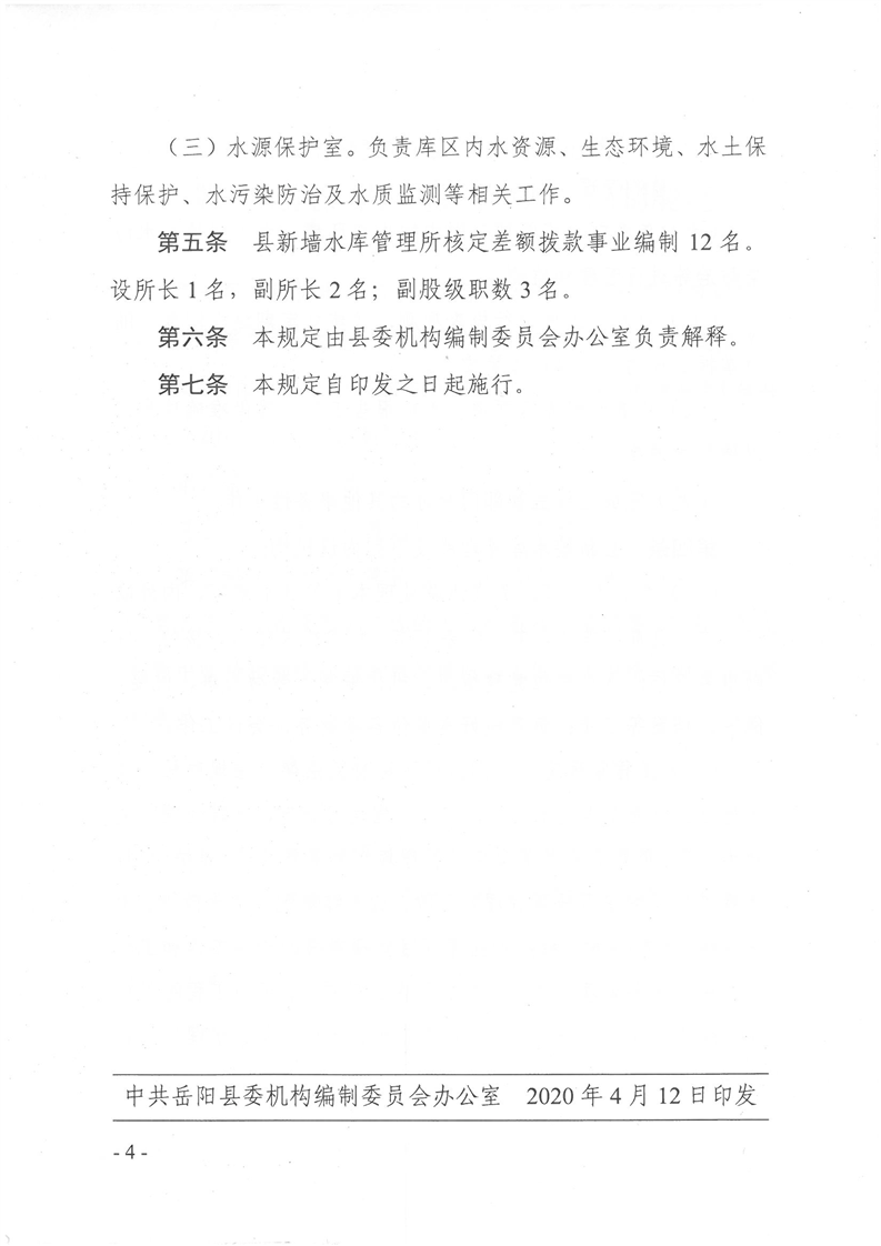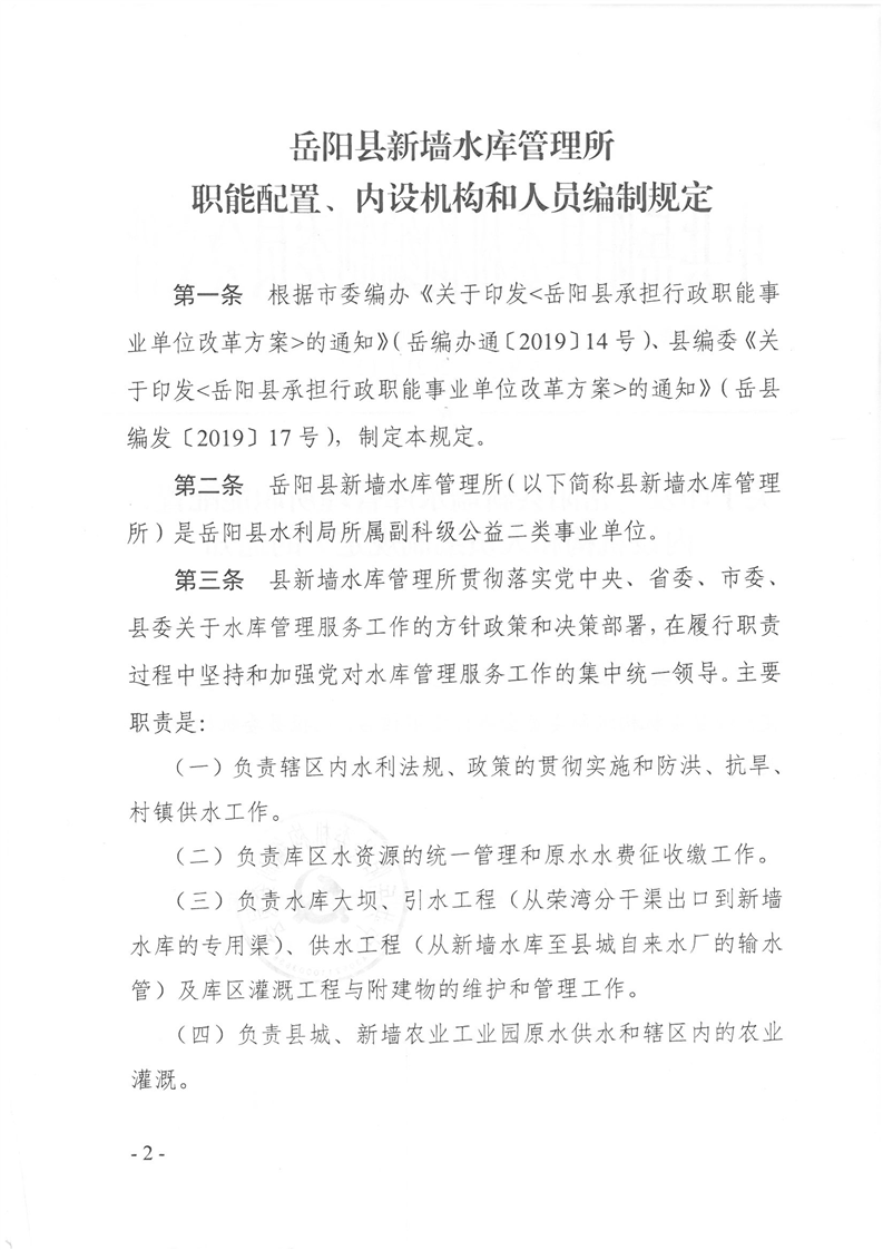 嶽陽縣新牆水庫管理所職能配置、內設機構和人員編製規定