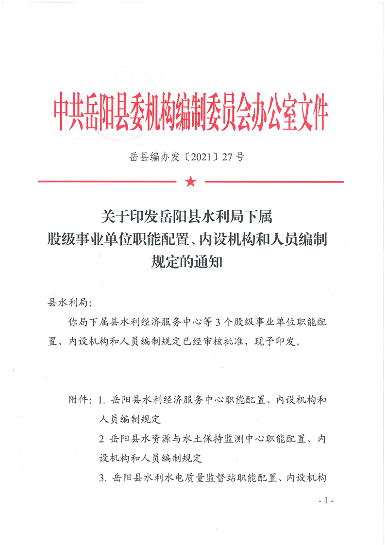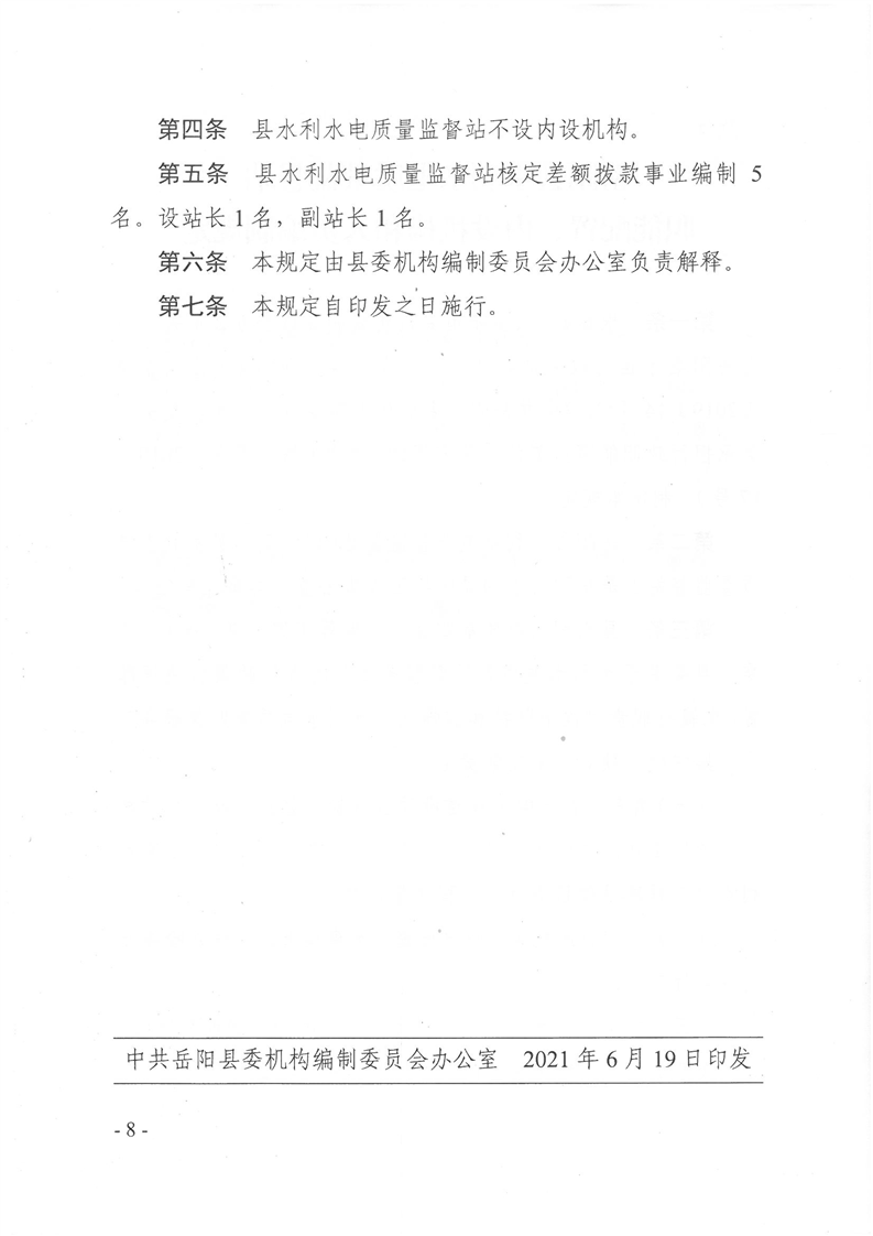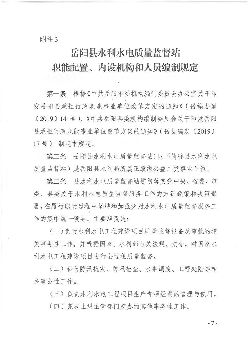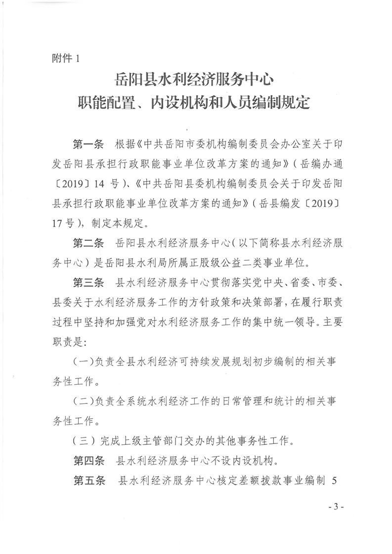嶽陽縣縣水利經濟服務中心、嶽陽縣水資源與水土保持監測中心、嶽陽縣水利水電質量監督站職能配置、內設機構和人員編製規定