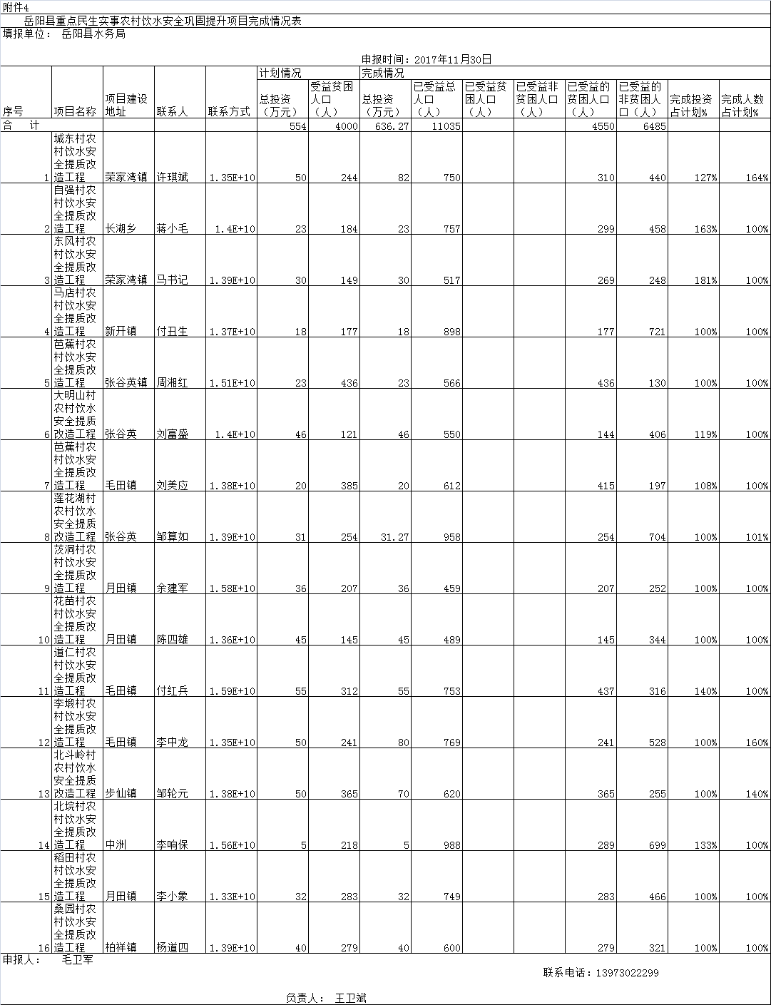 嶽陽縣2017年農村飲水安全項目完成情況