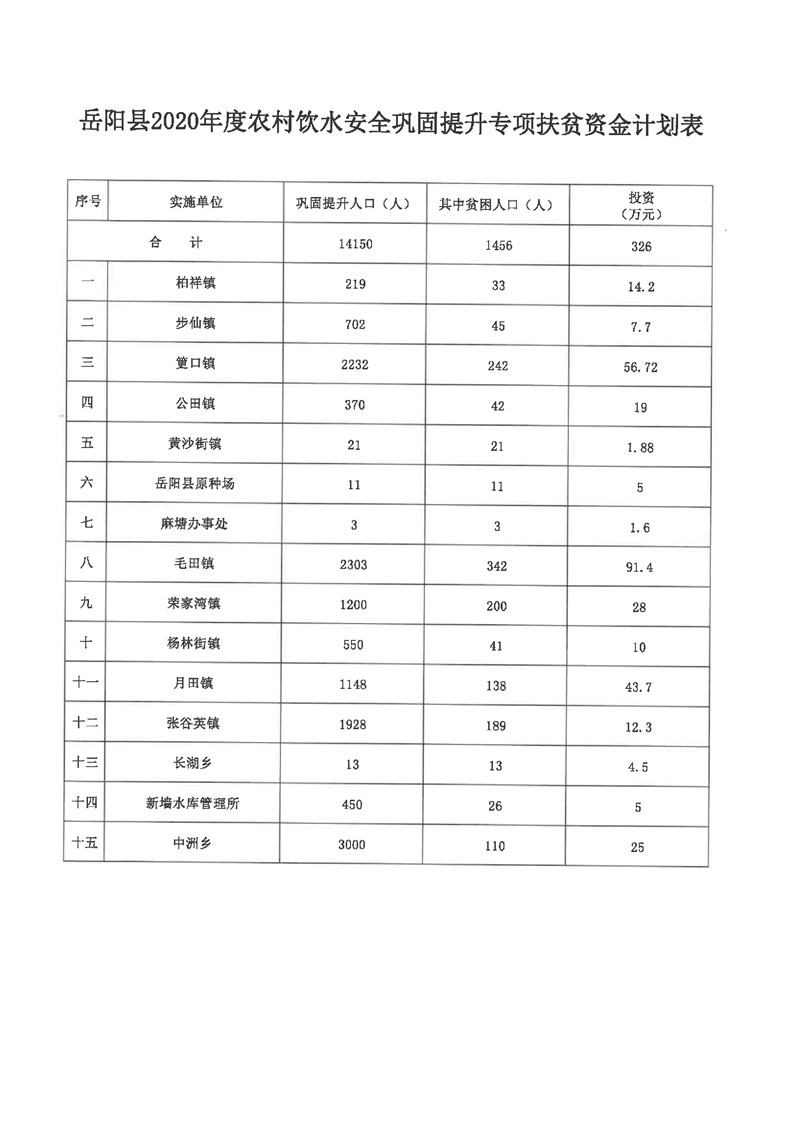 嶽陽縣水利局關於下達2020年農村飲水安全鞏固提升專項扶貧資金計劃的通知