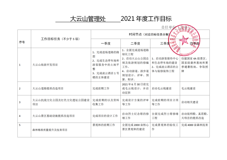 大雲山國家森林公園管理處2021年度工作目標任務