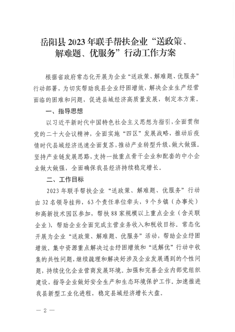 關於印發《嶽陽縣2023年聯手幫扶企業“送政策、解難題、優服務”行動工作方案》的通知