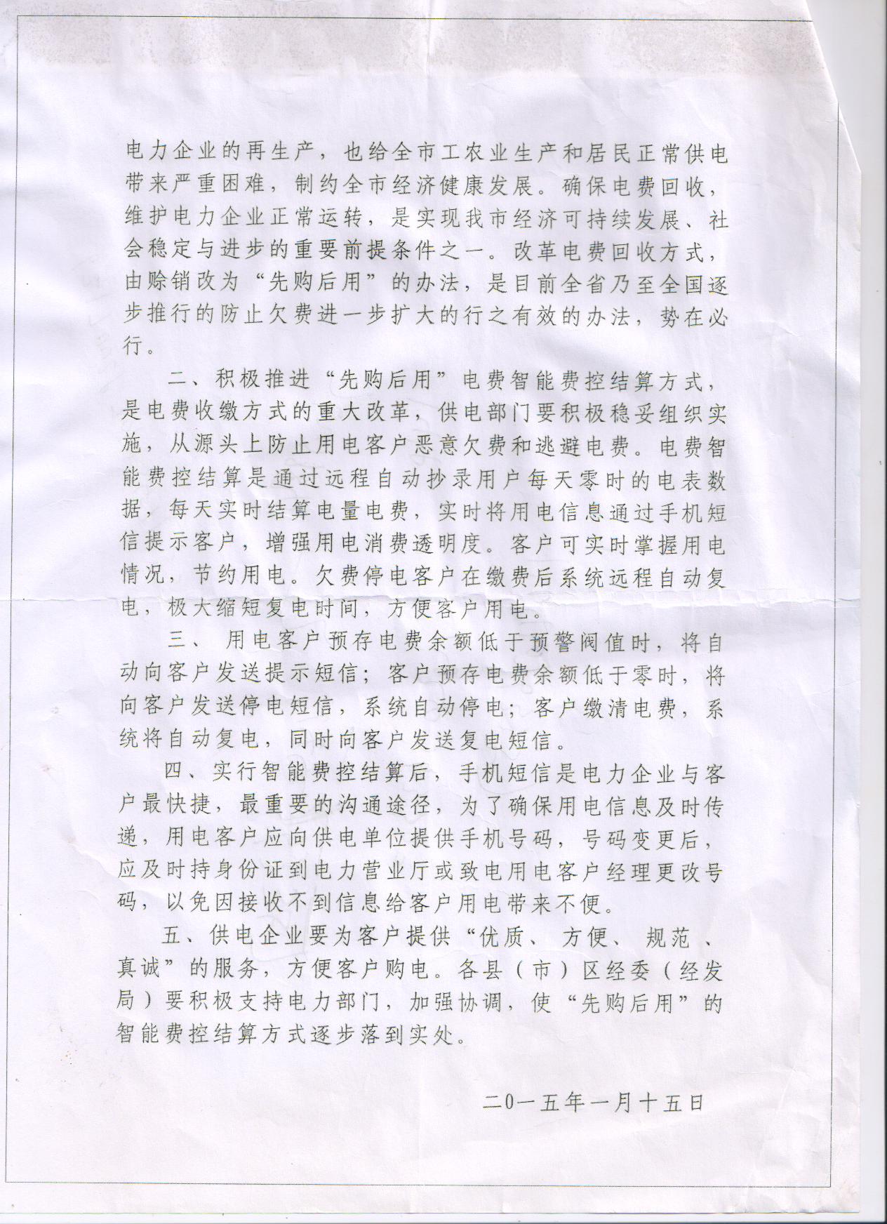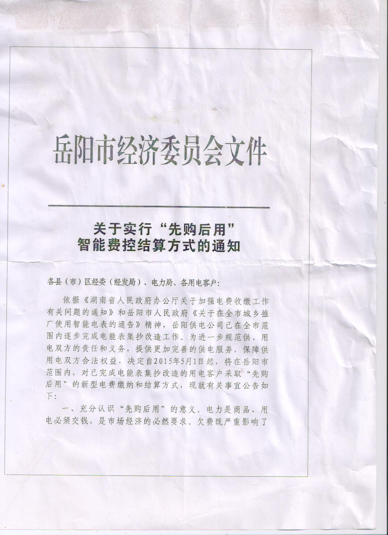 嶽陽市經濟委員會實行“先購後用”智能費控結算方式的通知