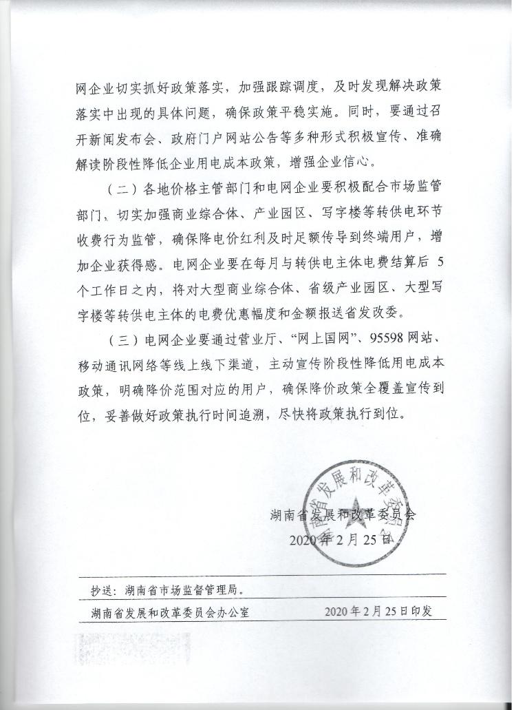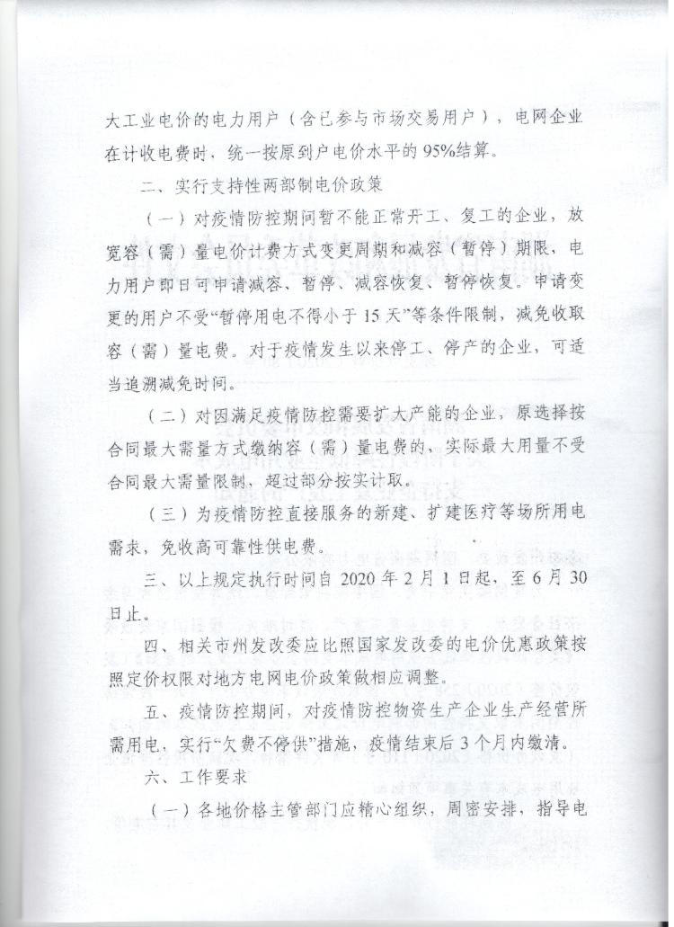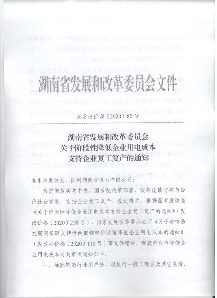 關於階段性降低企業用電成本支持企業複工複產的通知
