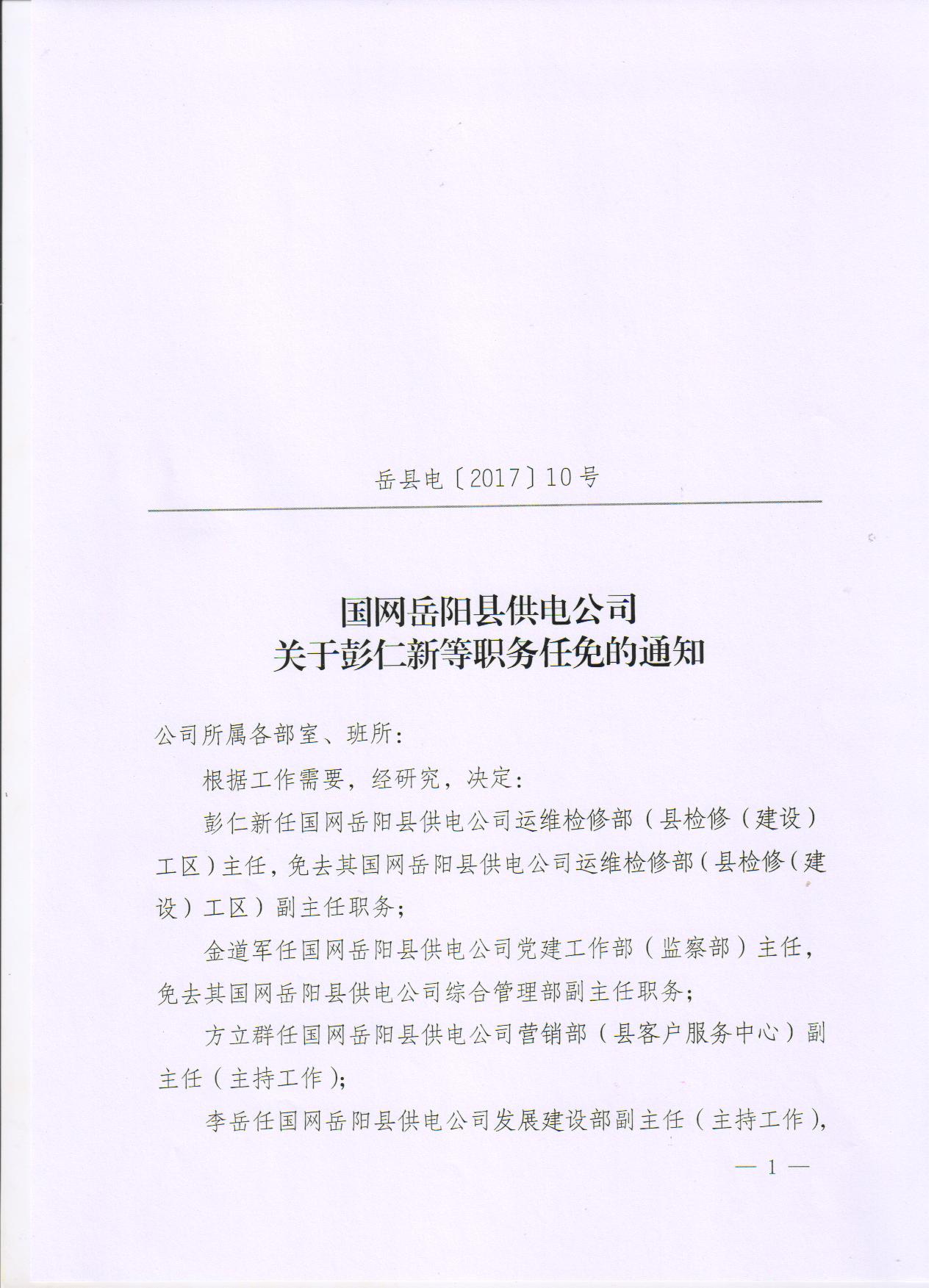 國網嶽陽縣供電公司關於彭仁新等職務任免的通知