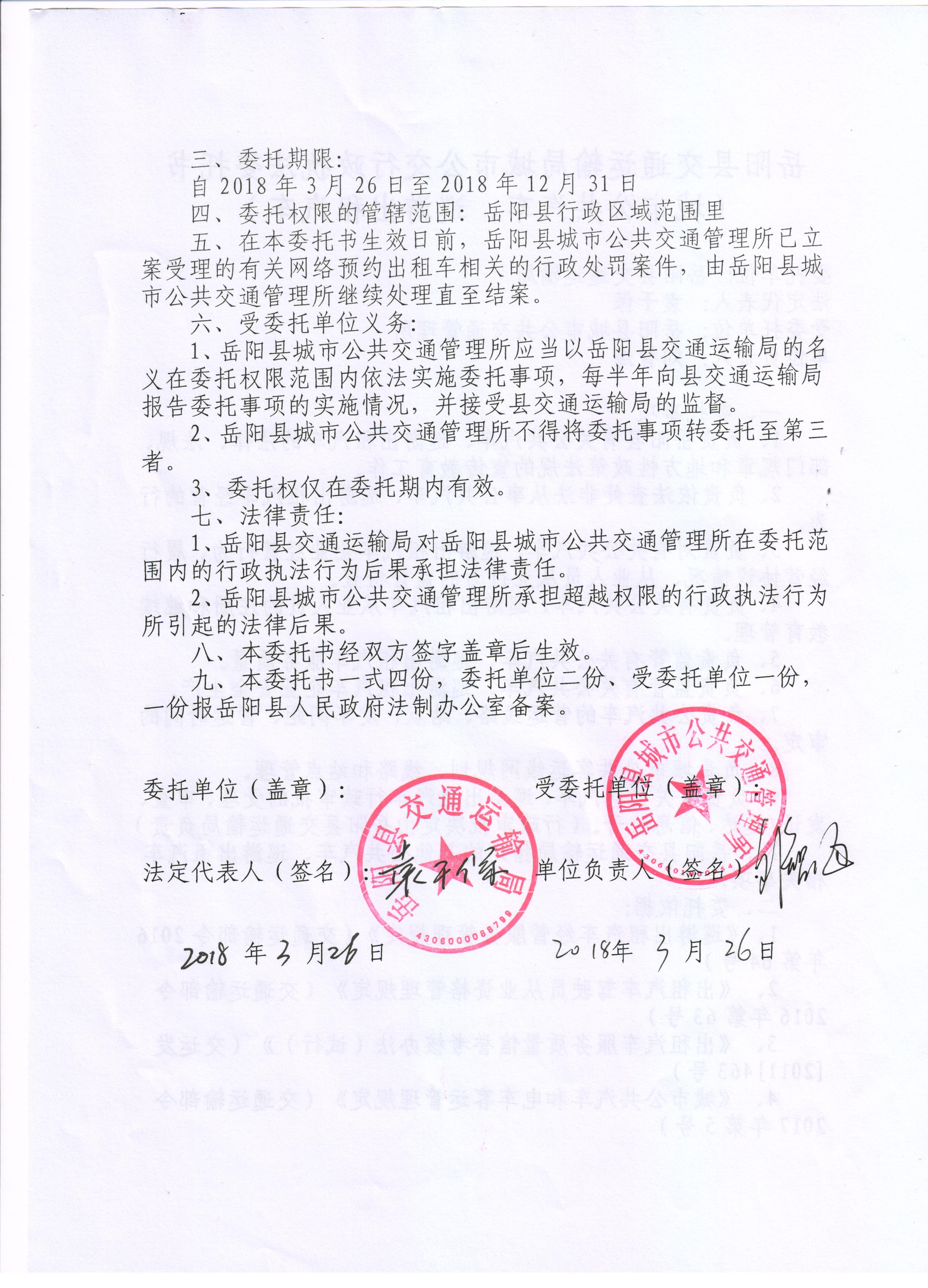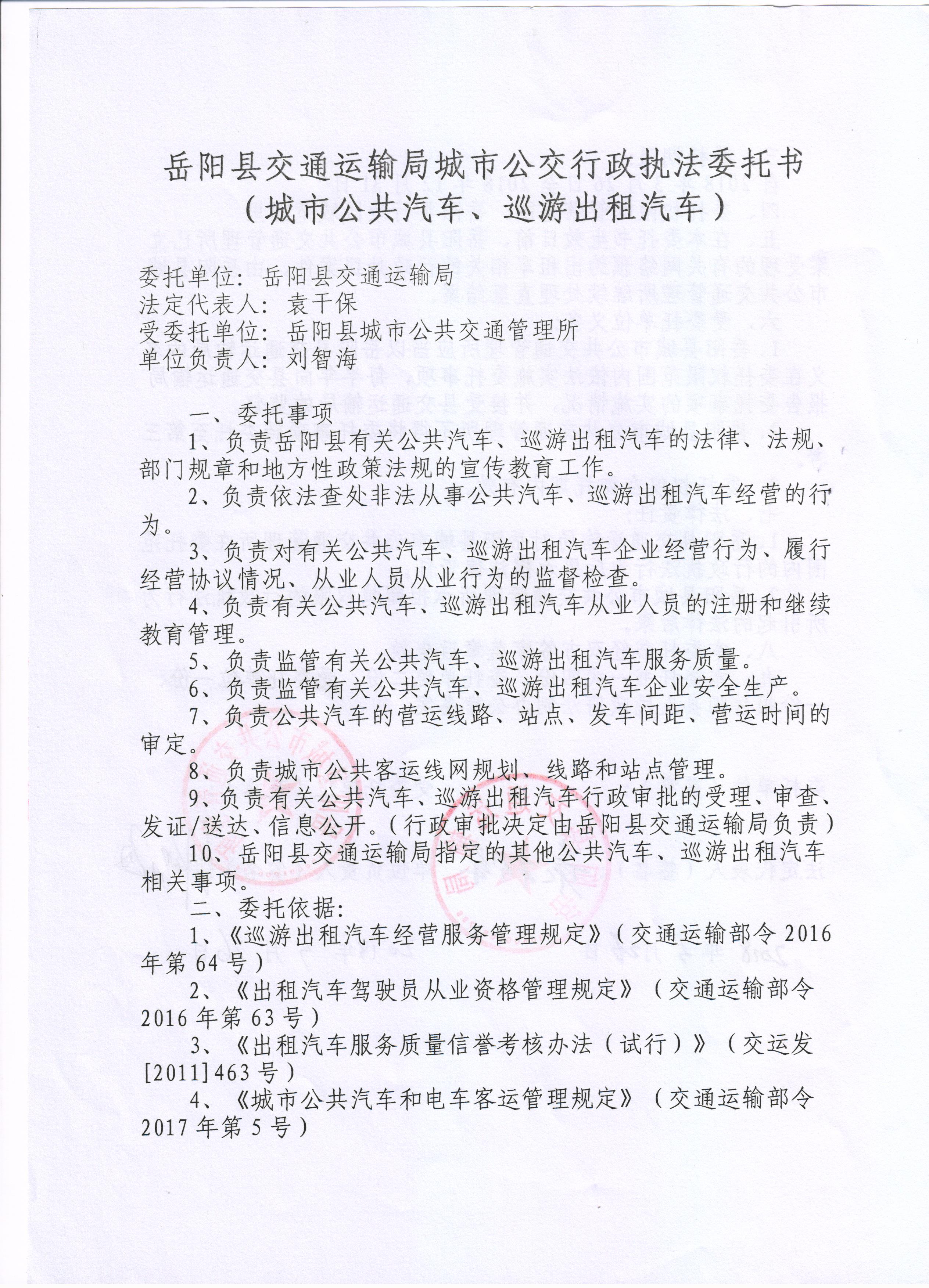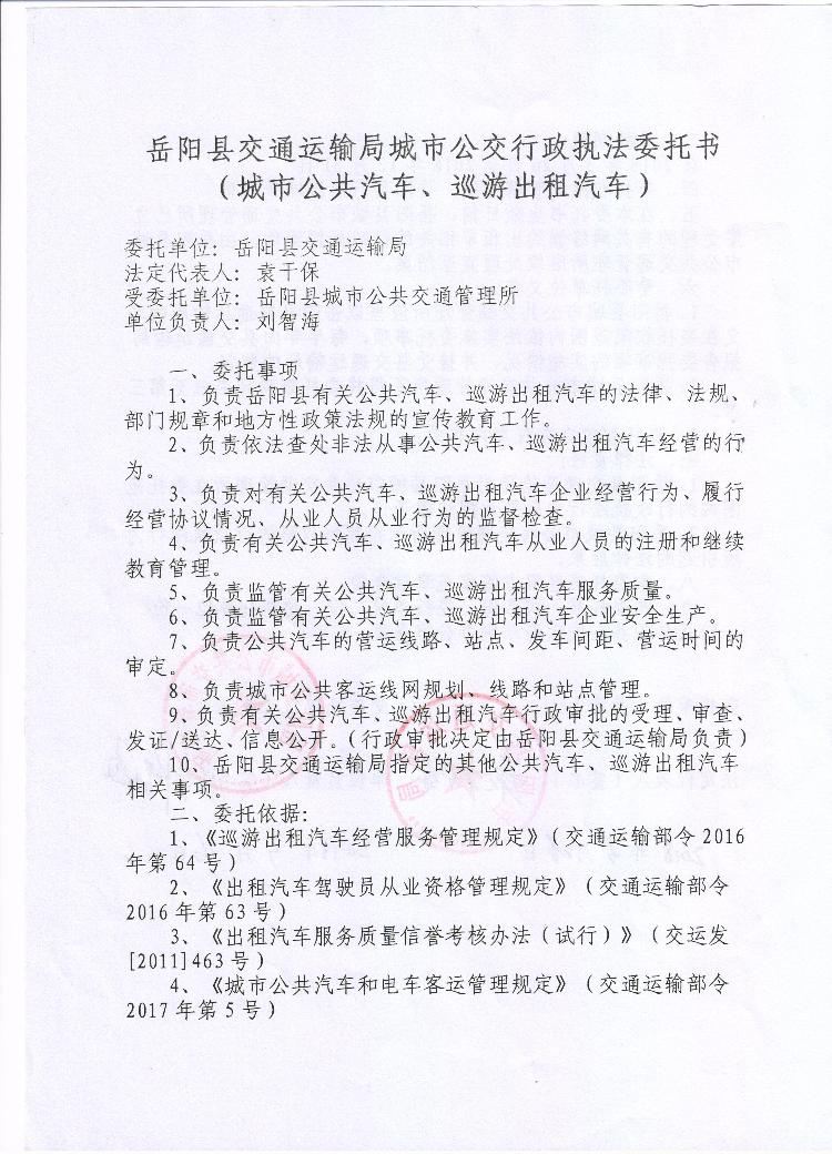 嶽陽縣交通運輸局城市公交行政執法委托書(城市公共汽車、巡遊出租汽車)