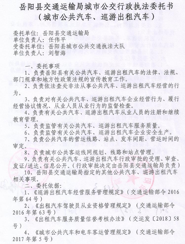 嶽陽縣城市公共汽車巡遊出租汽車行政執法委托書(20190601-20191231)