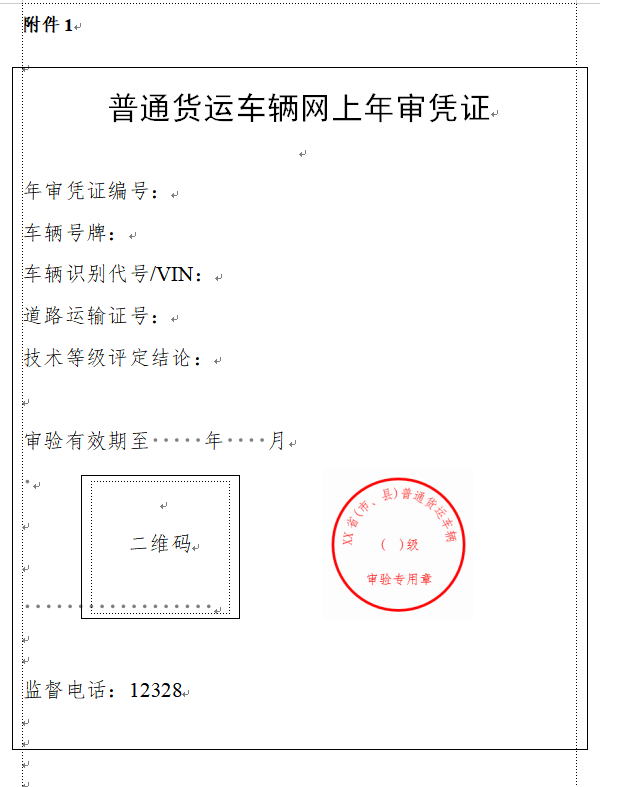 審驗符合要求的,道路貨物運輸經營者可通過全國互聯網道路運輸便民政務服務係統下載《普通貨運車輛網上年審憑證》(參考樣式見附件1)並留存。電子印章(參考樣式見附件1)標注在《普通貨運車輛網上年審憑證》上,由審驗機關加蓋。