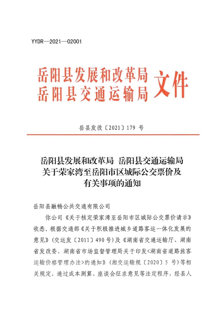 關於榮家灣至嶽陽市區城際公交票價及有關事項的通知