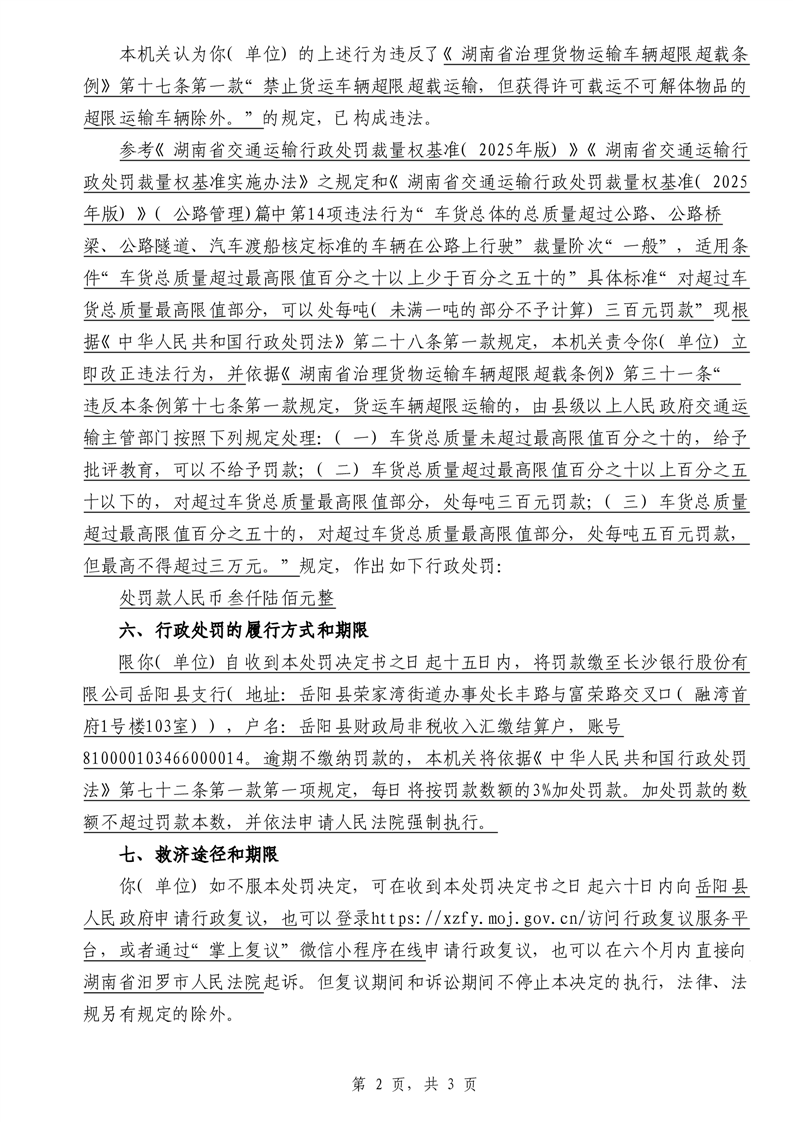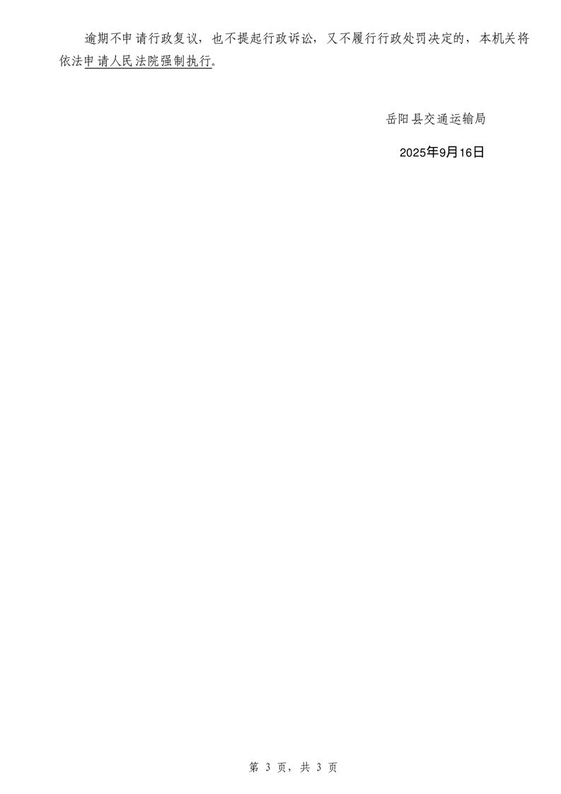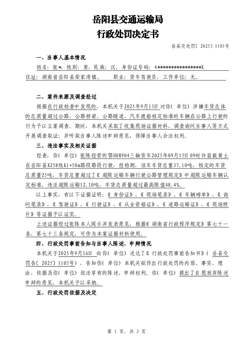 行政處罰決定書 嶽縣交處罰〔2025〕1105號