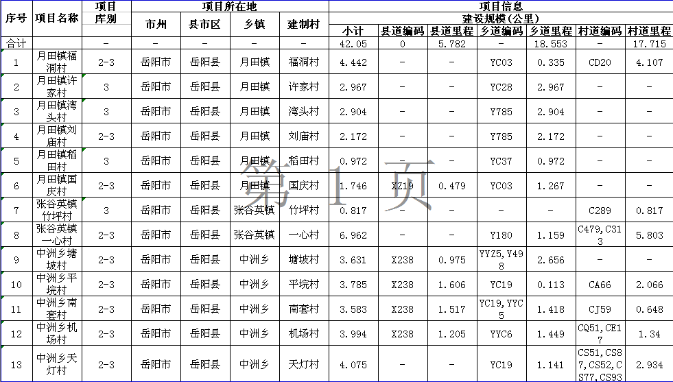 2015年嶽陽縣農村公路通暢工程建議計劃明細表