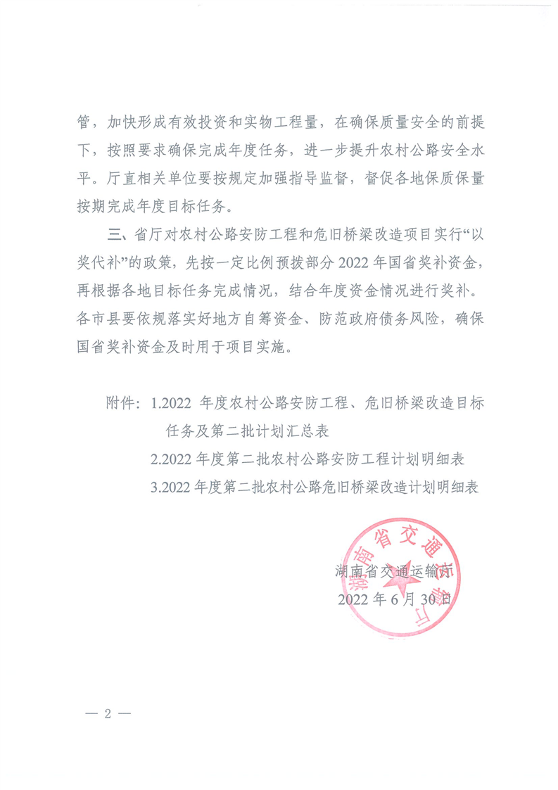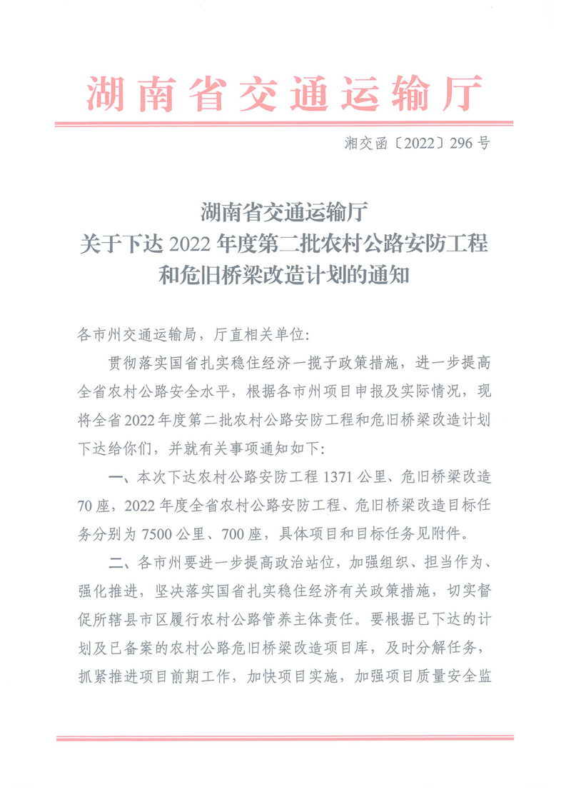 關於下達2022年度第二批農村公路安防工程和危舊橋梁改造計劃的通知
