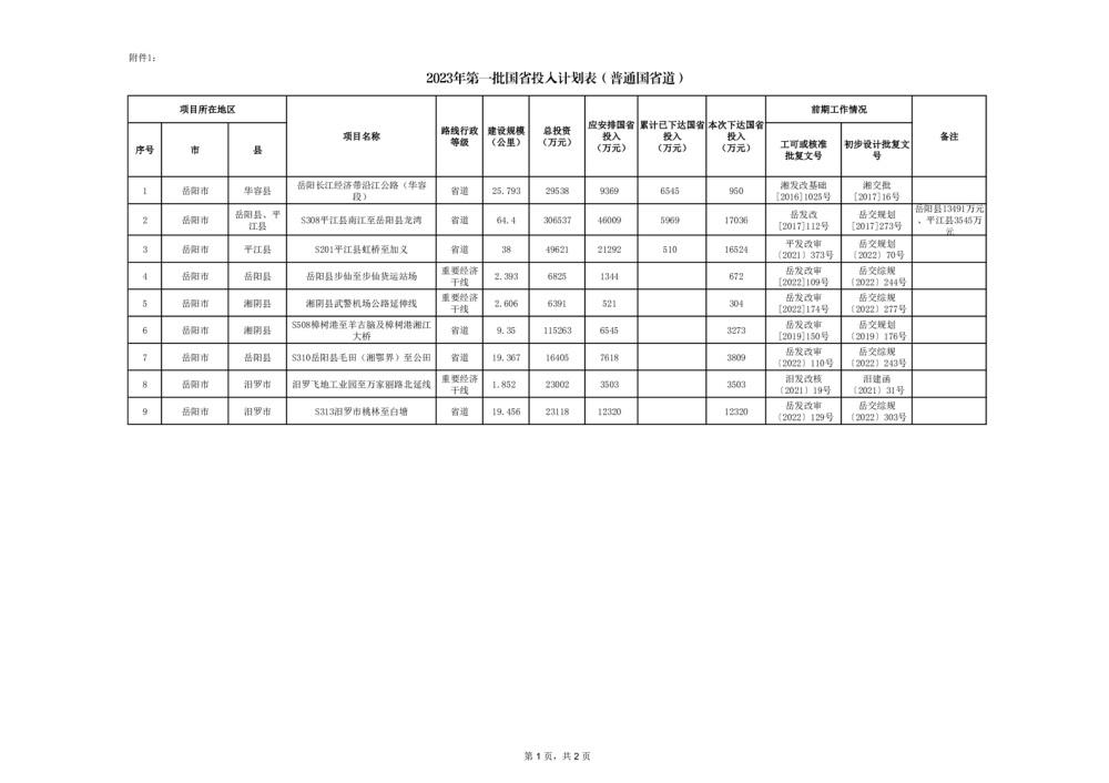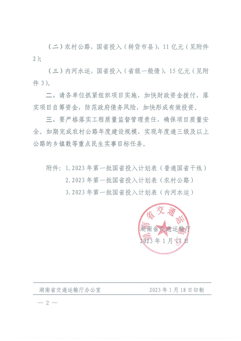 湖南省交通運輸廳關於下達2023年第一批國省投入計劃的通知