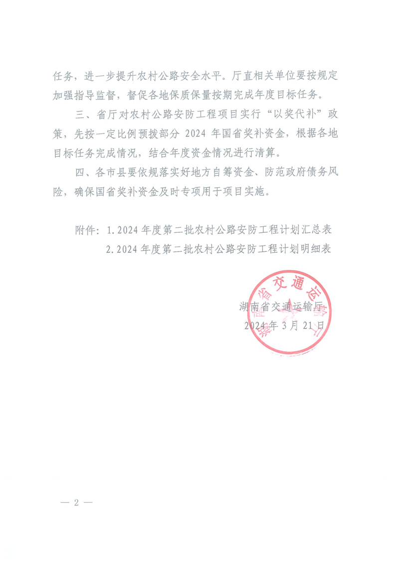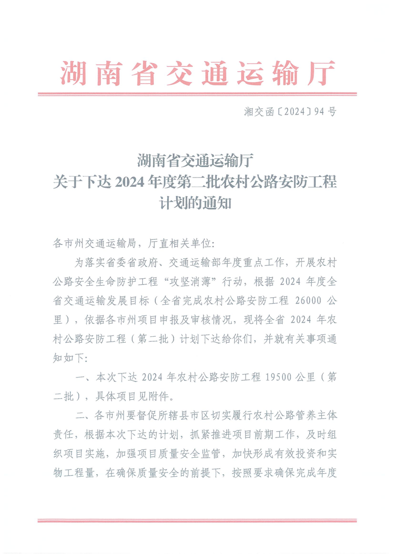 關於下達2024年度第二批農村公路安防工程計劃的通知