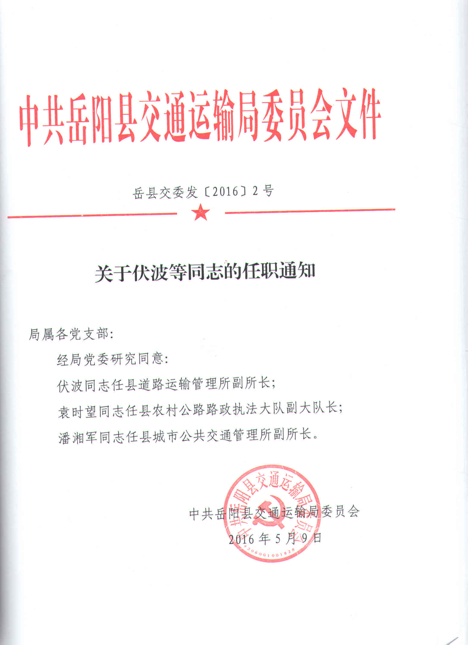 關於伏波等同誌的任職通知