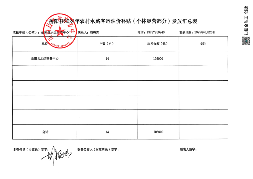 2025年發放2024年度嶽陽縣農村水路客運油價補貼