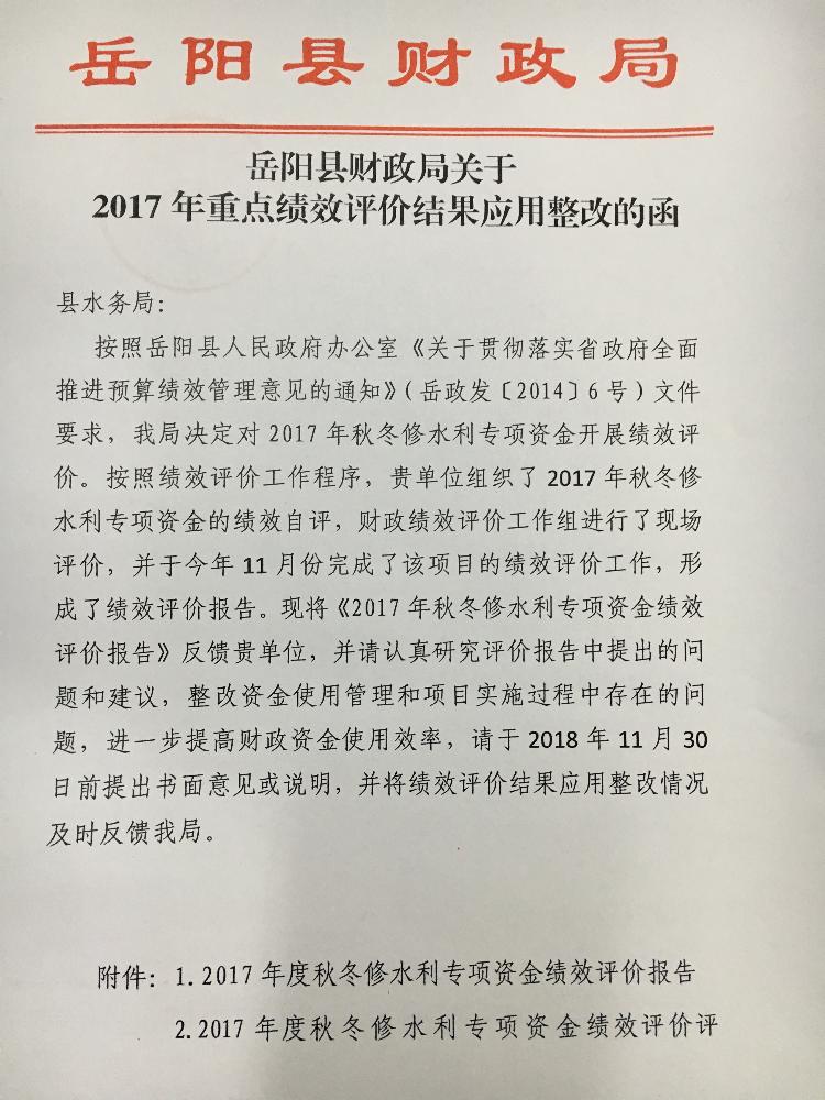 關於2017年重點績效評價結果應用整改的函(秋冬修水利)