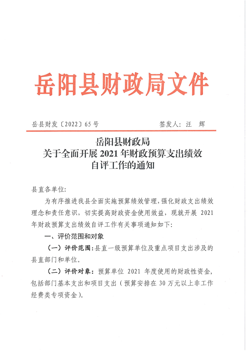 嶽陽縣財政局關於全麵開展2021年財政預算支出績效自評工作的通知