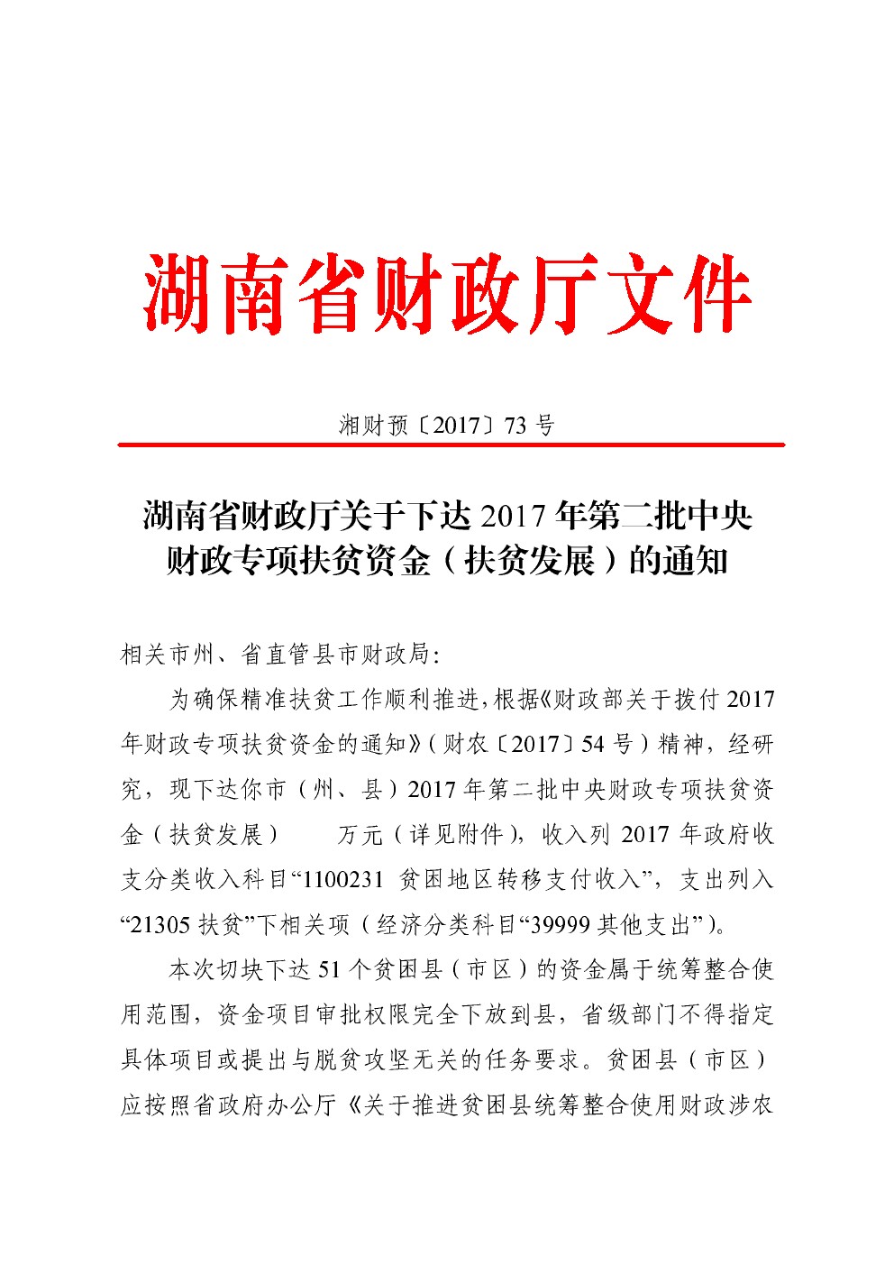 關於下達2017年第二批中央財政專項扶貧資金(扶貧發展)的通知