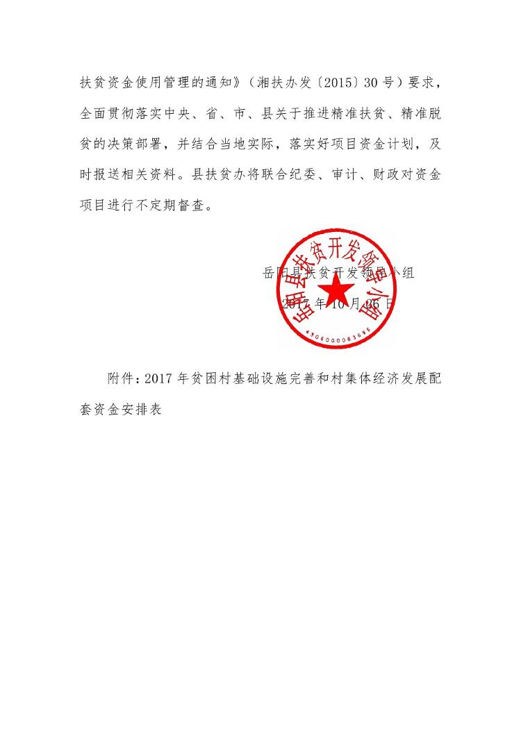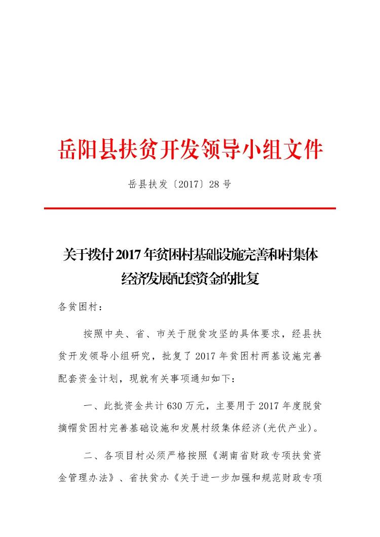 嶽縣扶發【2017】28號——關於撥付2017年貧困村兩基設施完善配套資金的批複