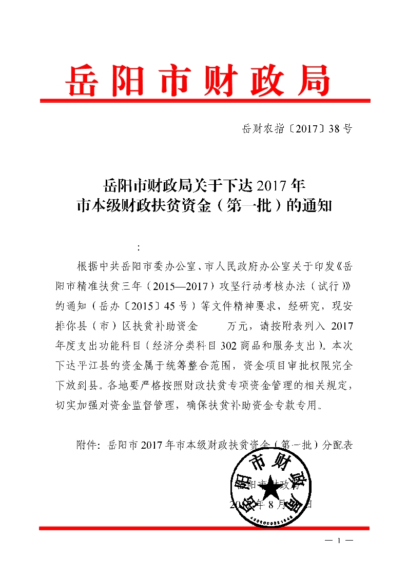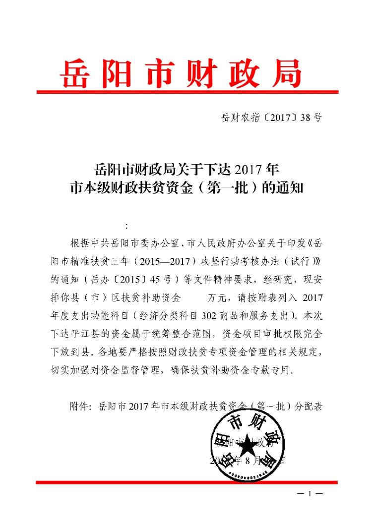 | 嶽陽市2017年市本級財政扶貧資金(第一批)分配表 |