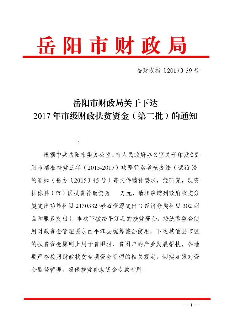 嶽陽市2017年第二批市級財政扶貧資金分配表