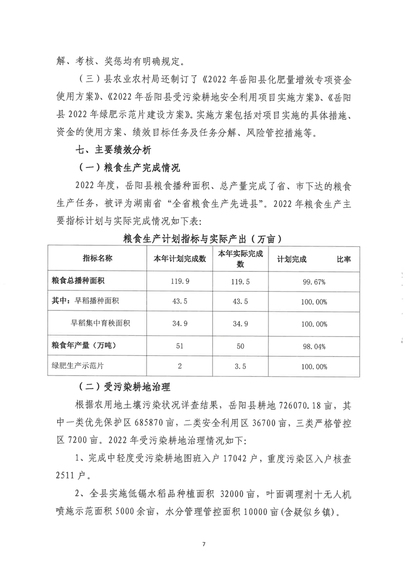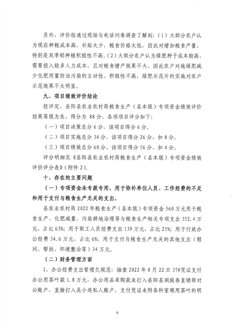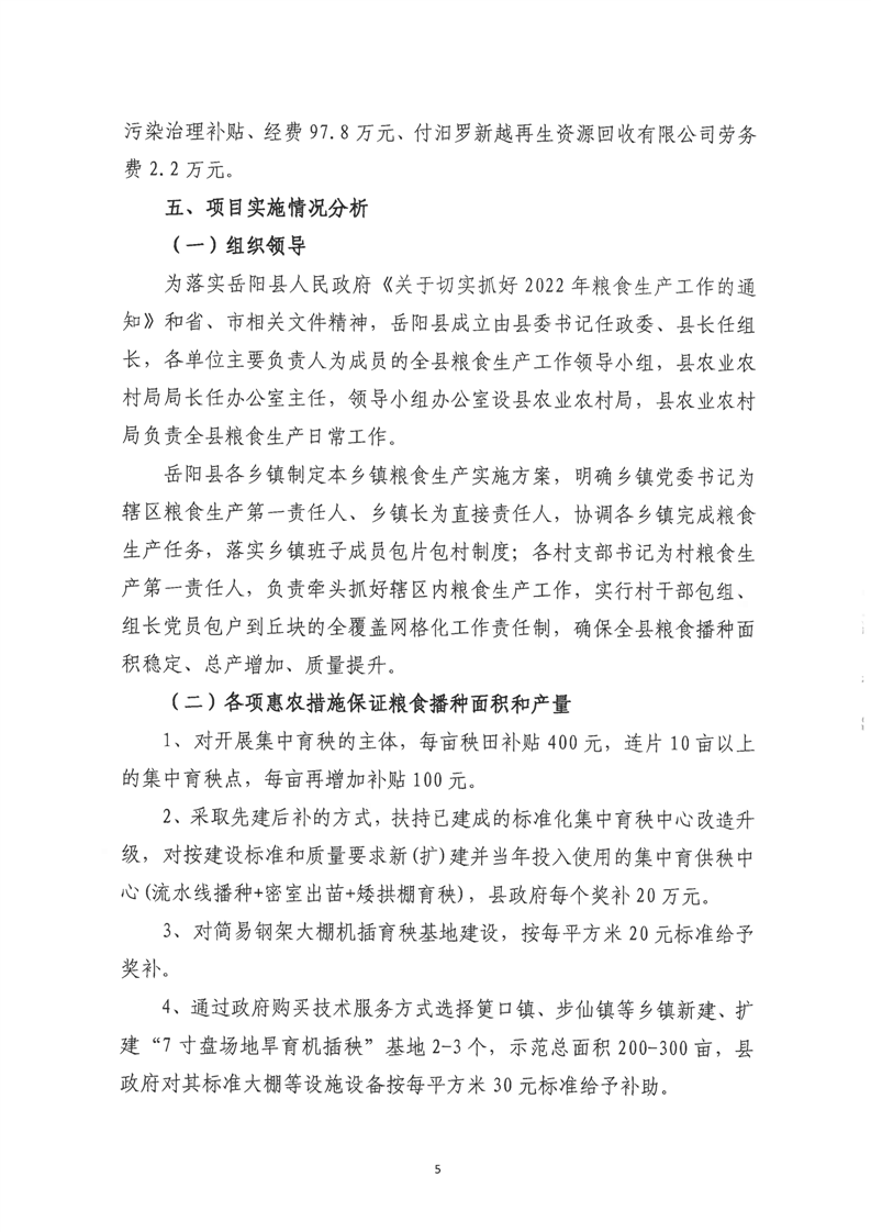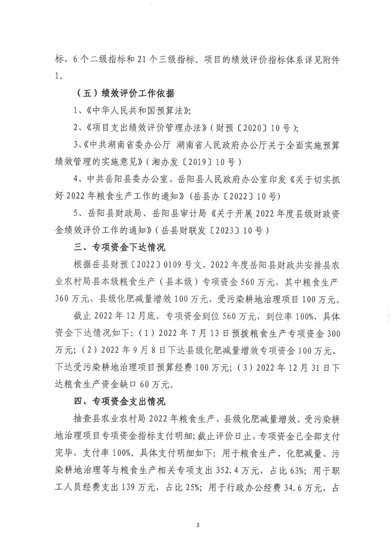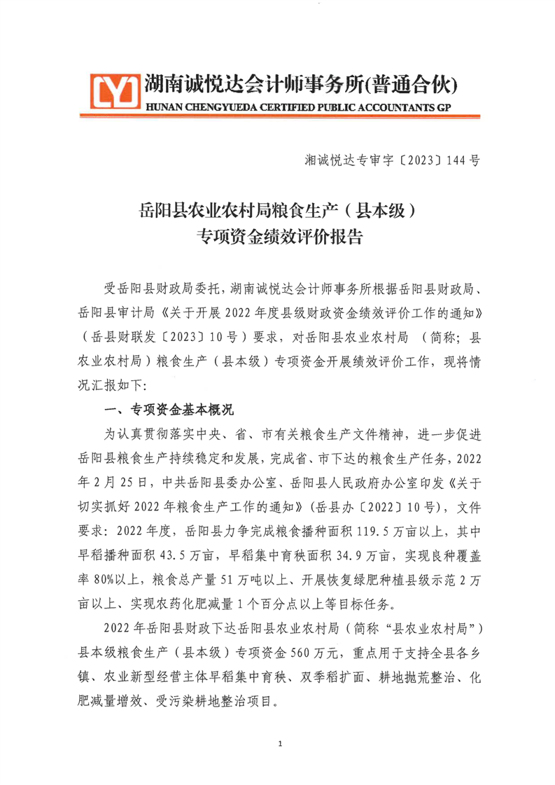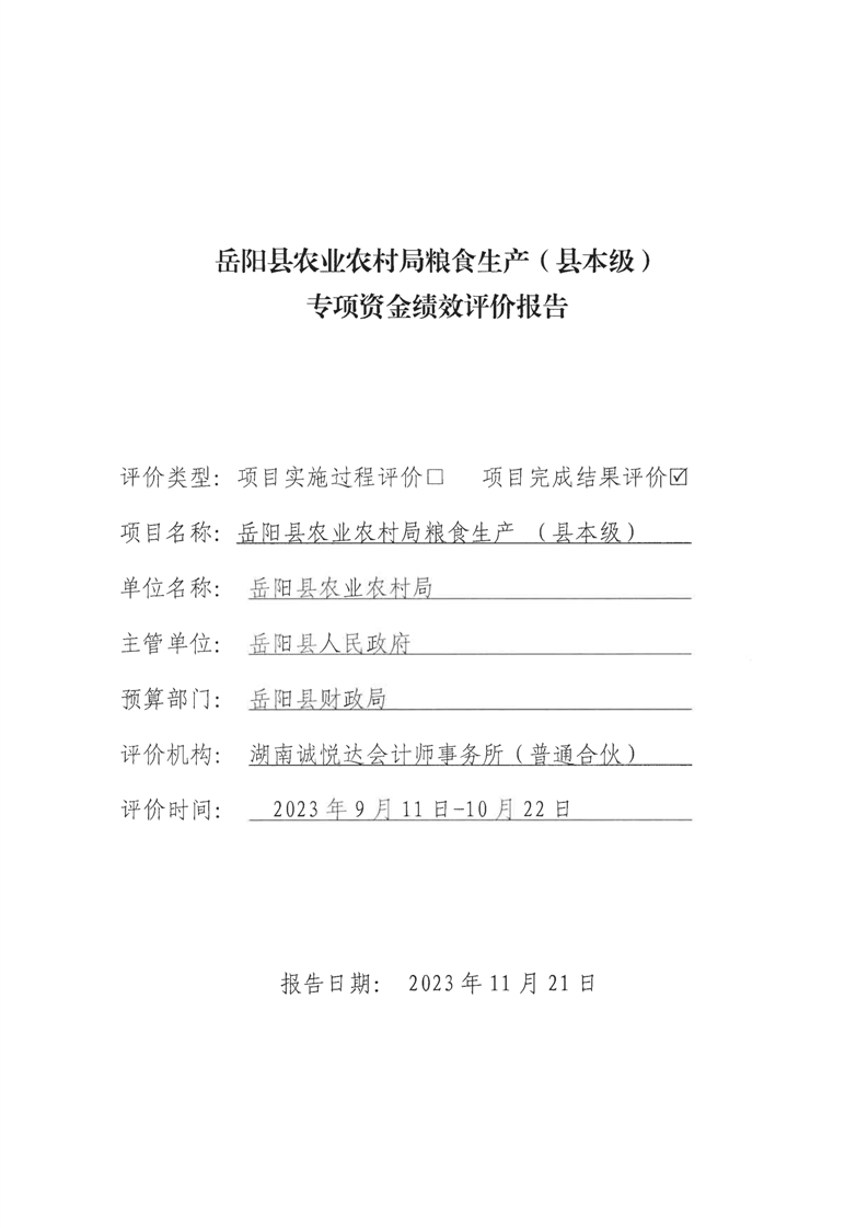 嶽陽縣農業農村局糧食生產(縣本級)專項資金績效評價報告