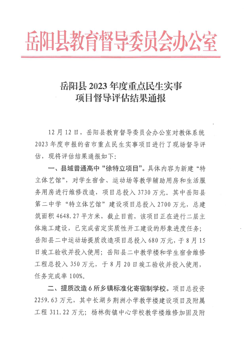 嶽陽縣教體係統2023年度重點民生實事項目督導評估初評結果通報