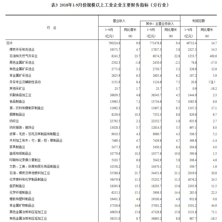 1-9月份,在41個工業大類行業中,34個行業利潤總額同比增加,7個行業減少。主要行業利潤情況如下:煤炭開采和洗選業利潤總額同比增長14.5%,石油和天然氣開采業增長4倍,農副食品加工業增長2.3%,紡織業增長2.7%,石油、煤炭及其他燃料加工業增長30.8%,化學原料和化學製品製造業增長24.5%,非金屬礦物製品業增長44.9%,黑色金屬冶煉和壓延加工業增長71.1%,通用設備製造業增長8.5%,專用設備製造業增長21.3%,電氣機械和器材製造業增長2.7%,計算機、通信和其他電子設備製造業增長2.3%,電力、熱力生產和供應業增長9.2%,有色金屬冶煉和壓延加工業下降16.5%,汽車製造業下降3.8%。