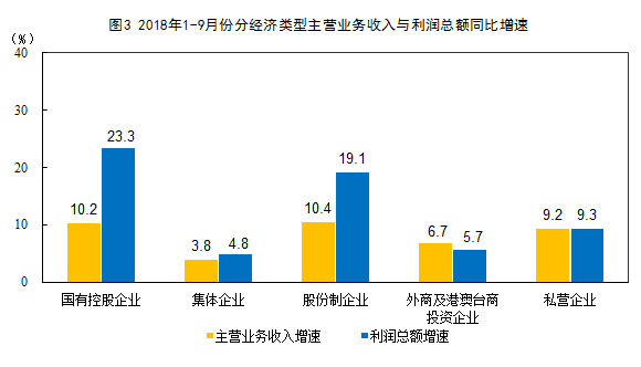 1-9月份,規模以上工業企業中,國有控股企業實現利潤總額15294.3億元,同比增長23.3%;集體企業實現利潤總額145.9億元,增長4.8%;股份製企業實現利潤總額35088.8億元,增長19.1%;外商及港澳台商投資企業實現利潤總額12352.8億元,增長5.7%;私營企業實現利潤總額12591.5億元,增長9.3%。