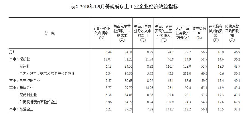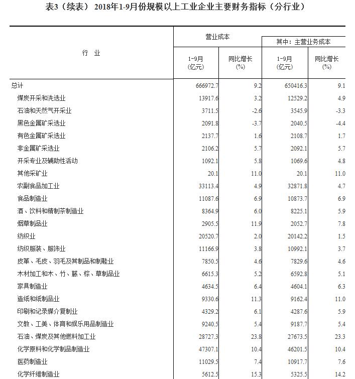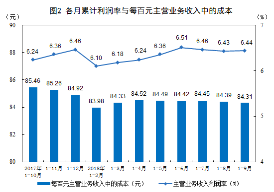 1-9月份,規模以上工業企業實現主營業務收入77.1萬億元,同比增長9.4%;發生主營業務成本65萬億元,增長9.1%;主營業務收入利潤率為6.44%,同比提高0.29個百分點。