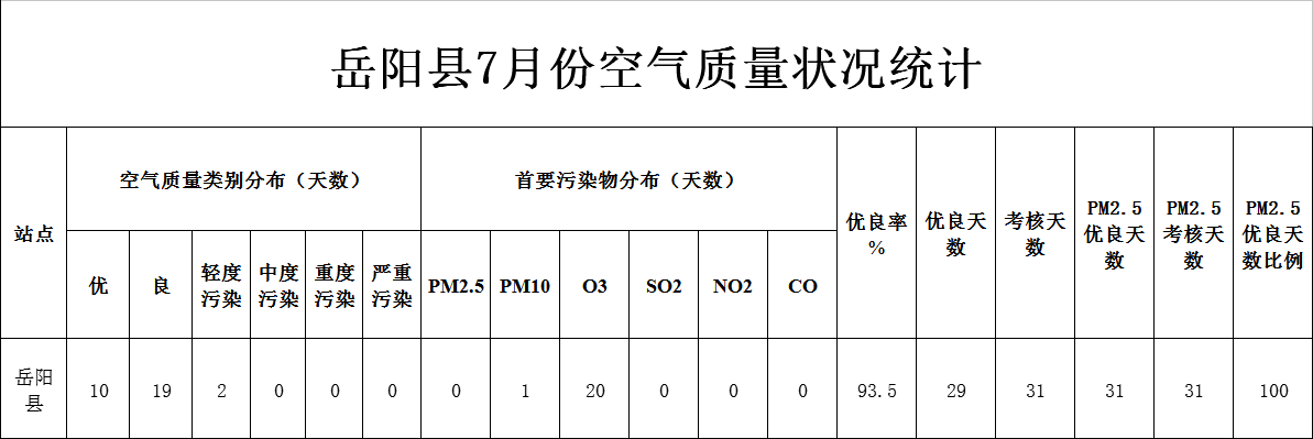 嶽陽縣7月份空氣質量狀況統計