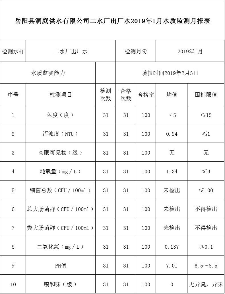 嶽陽縣洞庭供水有限公司二水廠出廠水2019年1月水質監測月報表
