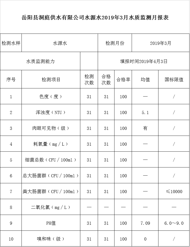 嶽陽縣洞庭供水有限公司水源水2019年3月水質監測月報表