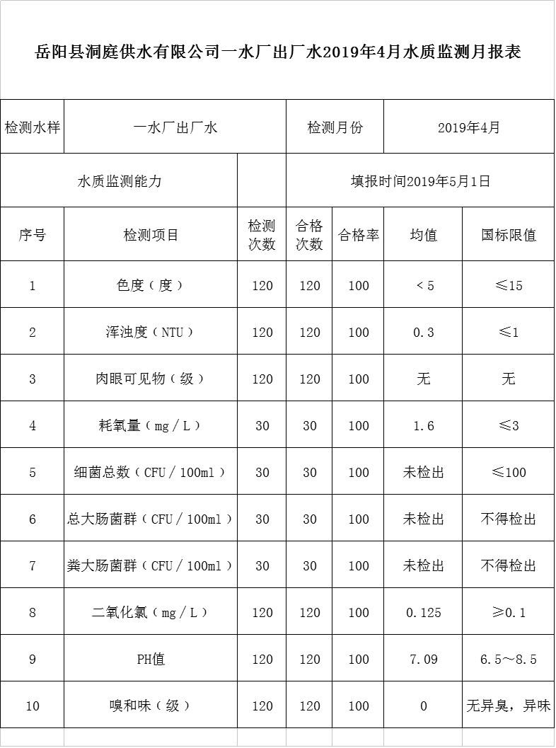 嶽陽縣洞庭供水有限公司一水廠出廠水2019年4月水質監測月報表