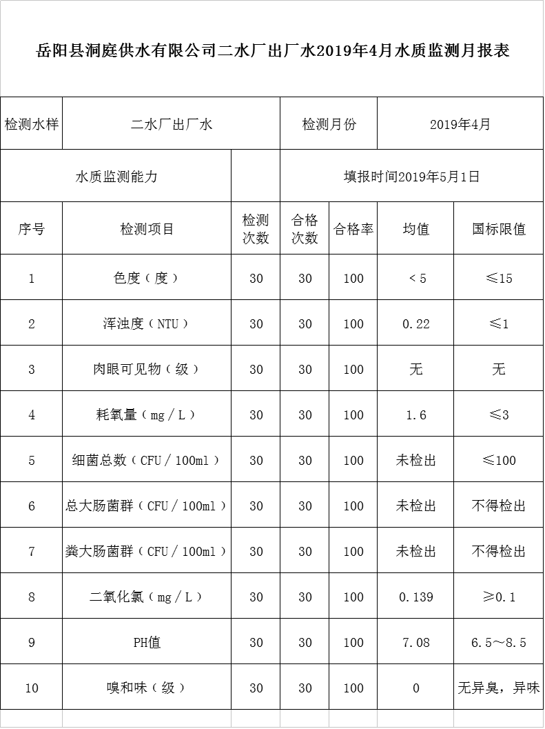 嶽陽縣洞庭供水有限公司二水廠出廠水2019年4月水質監測月報表
