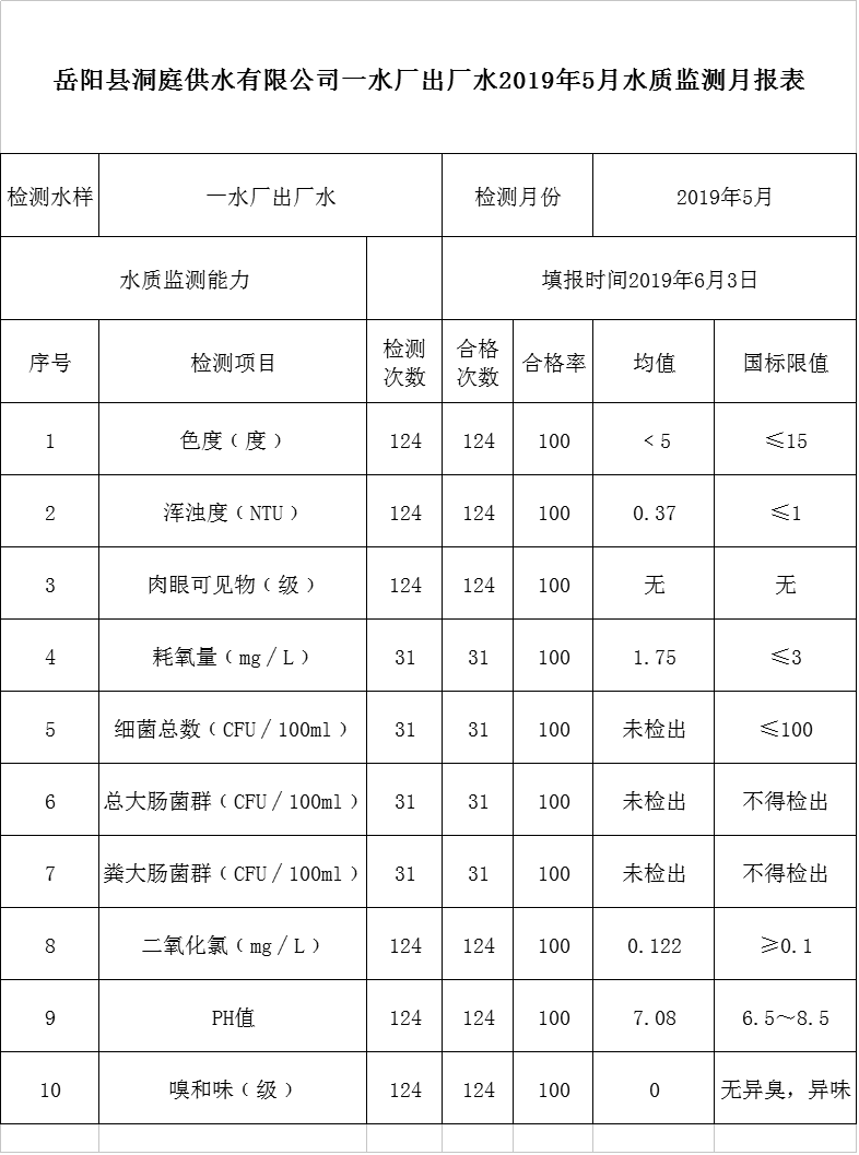 嶽陽縣洞庭供水有限公司一水廠出廠水2019年5月水質監測月報表
