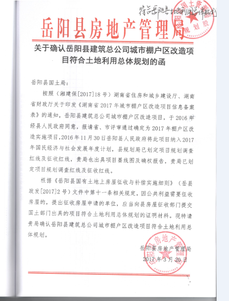 關於確認嶽陽縣建築總公司城市棚戶區改造項目符合土地利用總體規劃的函
