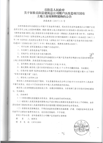 嶽陽縣人民政府關於征收嶽陽縣建築總公司棚戶區改造項目國有土地上房屋和附屬物的公告