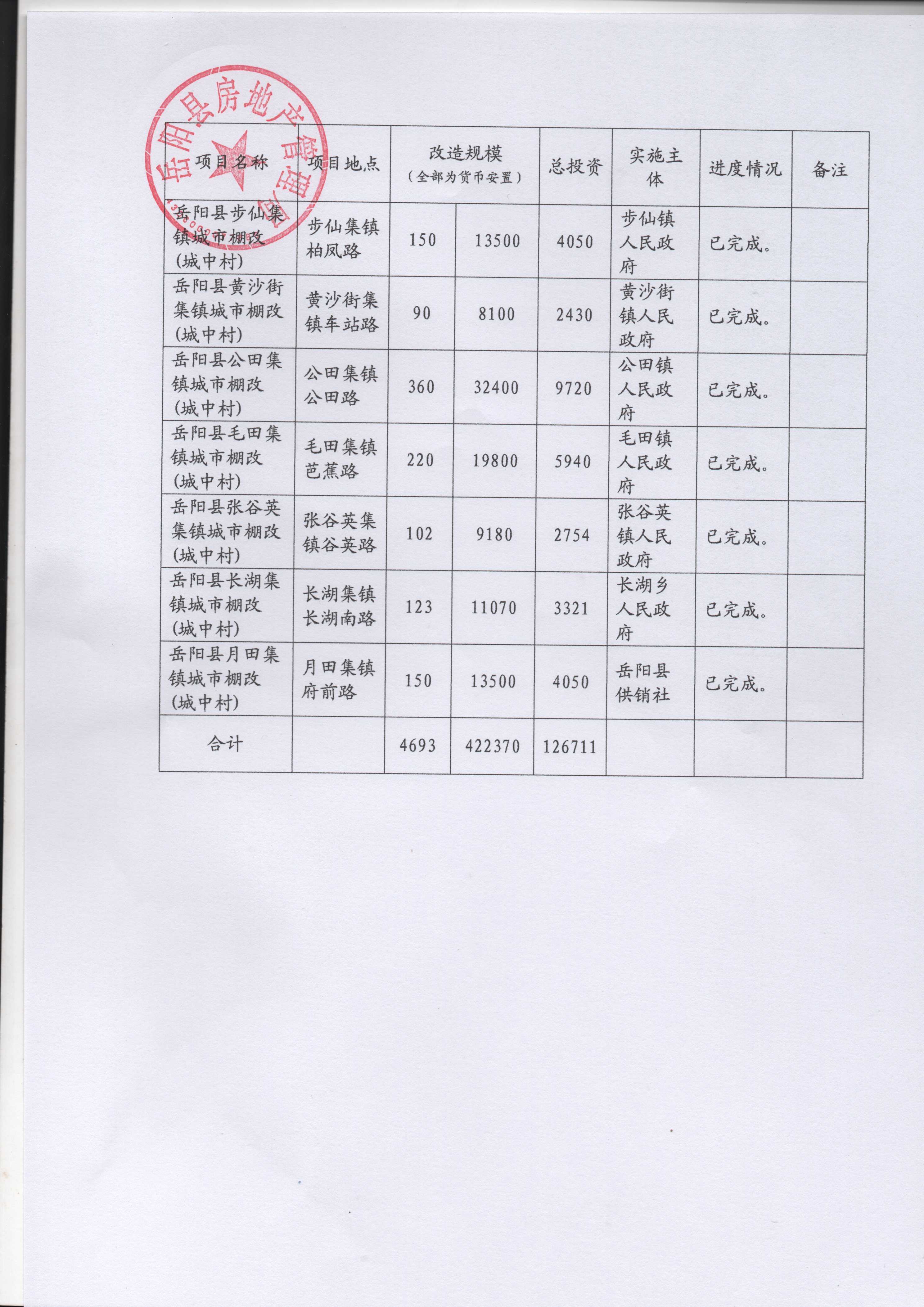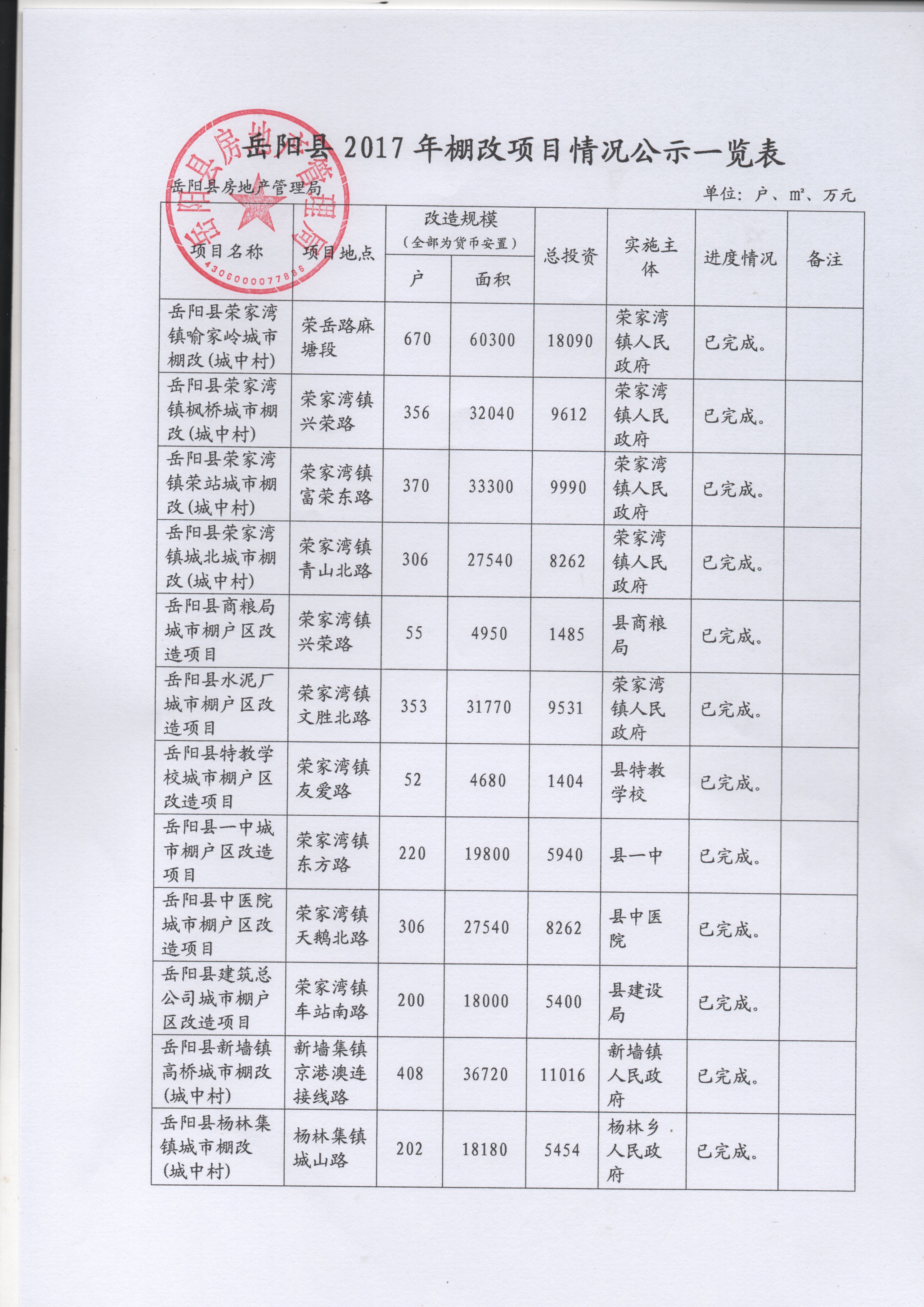 嶽陽縣2017年棚改項目情況公示一覽表